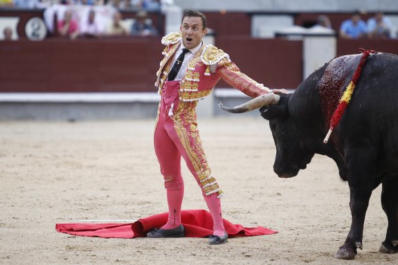 Su apuesta para Madrid no era fácil. Para enfrentarse a toros de Miura y José Escolar hay que tener un par. Una gesta al alcance de muy pocos. Desde luego una proeza que esas figuras de mazapán y pitiminí de ahora, parafraseando a la Marquesa de Seoane, no han conseguido ni se han propuesto realizar. Lo cierto es que le tocaron en suerte dos lotes dificilísimos de los hierros antes citados. Debe ser un trago que el primer toro que toreas en la feria te quiera quitar la cabeza. Ahí está la imagen.