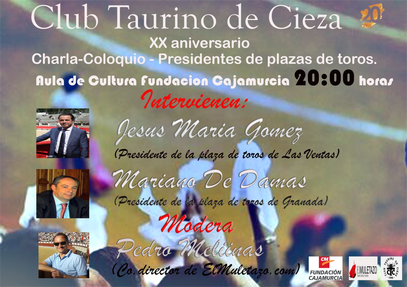 -Viernes 23 de Noviembre, a las 8 de la tarde, Charla-Coloquio en el Aula de Caja-Murcia, en la que intervendrán los presidentes de plazas de toros: Jesús María Gómez y Mariano de Damas, de las Ventas de Madrid y Granada respectivamente. Moderará nuestro codirector Pedro M. Mellinas.