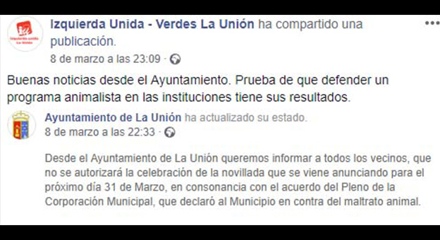 Una plataforma ciudadana de La Unión, dirigida en la sombra por Izquierda Unida, partido que apoya al gobierno socialista que dirige Pedro López Milán, ha remitido un comunicado donde se opone frontalmente a la celebración de la novillada benéfica organizada para el próximo domingo 31 de marzo cuya recaudación irá destinada al arreglo del suelo de una Iglesia que se supone que forma parte del patrimonio monumental de La Unión.