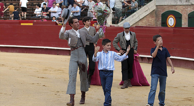 El alumno de la escuela taurina de Murcia, José María Trigueros, dio una vuelta al ruedo en la primera clase práctica del III Certamen de Escuelas Taurinas de Valencia celebrada este sábado 13 de julio en la plaza de toros de Valencia, festejo que abría la Feria de Julio de esta plaza de toros de primera categoría.