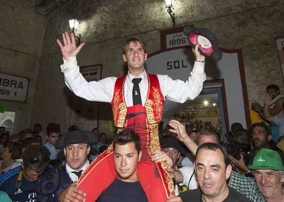 Foto: Raspa. José Manuel abandonando en volandas el ruedo de «La Caverina» de Calasparra aclamado por la afición.