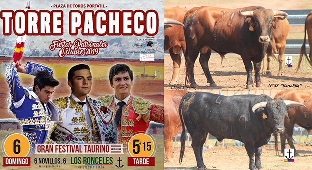 La empresa Úbeda Toros ha dado a conocer los novillos de “Los Ronceles” que se lidiaran en el cartel del festival taurino que se va a celebrar el próximo domingo 6 de octubre, a las 17.15 horas, en la localidad murciana de Torre Pacheco con motivo de sus fiestas patronales.