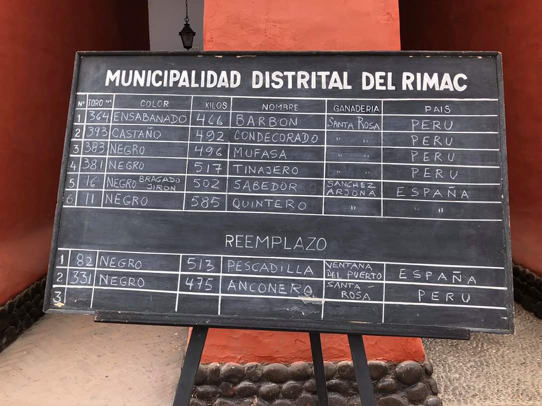 Cuatro ejemplares de la divisa peruana de Santa Rosa de Lima y dos de la ganadería española de Sánchez Arjona han sido sorteados y enchiquerados para la segunda corrida de toros de la Feria del Señor de los Milagros de Lima que se celebrará este domingo, 10 de noviembre. Frente a ellos, estarán los diestros Miguel Ángel Perera, el lorquino Paco Ureña y Joaquín Galdós.