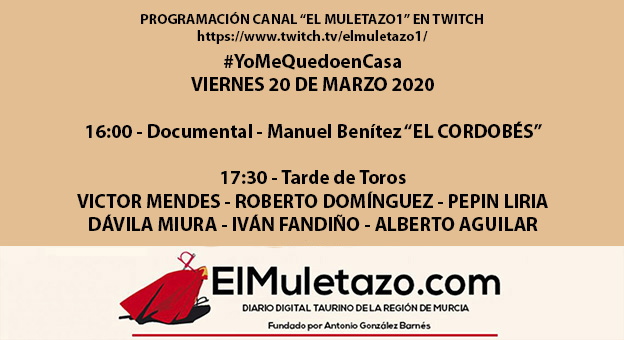 Para la tarde de este viernes 20 de marzo, otra más de confinamiento, en el canal “ElMuletazo1” de Twitch les tenemos preparada la siguiente programación:
