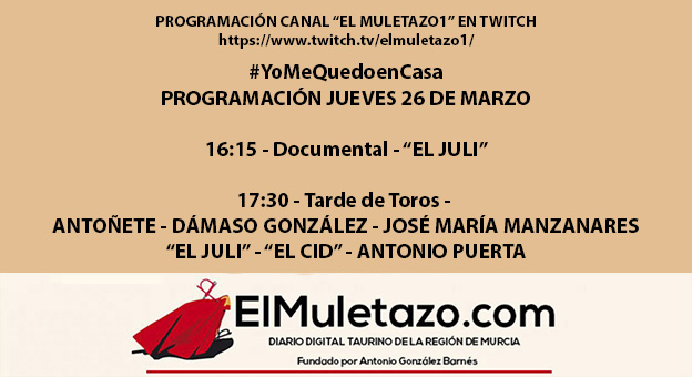 Para la tarde de este jueves 26 de marzo en el canal “ElMuletazo1” de Twitch les tenemos preparada la siguiente programación: