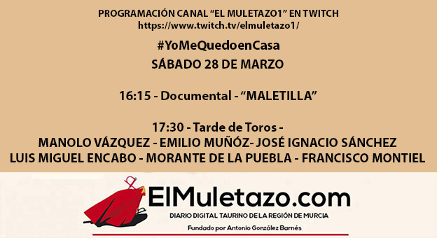 Para la tarde de este sábado 28 de marzo en el canal “ElMuletazo1” de Twitch les tenemos preparada la siguiente programación: