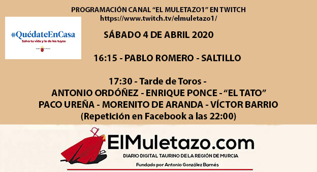 Para la tarde de este Sábado 4 de abril en el canal “ElMuletazo1” de Twitch les tenemos preparada la siguiente programación: