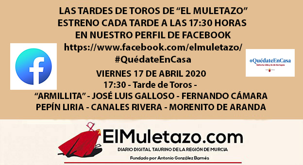 Para que las tardes de confinamiento les sean más agradables en esta segunda etapa del estado de alarma decretado por el Gobierno de España, ElMuletazo.com, como ha venido haciendo desde mediados del mes de marzo, les ofrece cada tarde una corrida de toros compuesta por seis faenas históricas de todos los tiempos. Algo que le hemos llamado la feria del #QuédateEnCasa y que la pueden seguir únicamente en nuestro perfil del Facebook, desde las 17:30 horas.