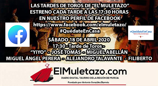 Para que las tardes de confinamiento les sean más agradables en esta segunda etapa del estado de alarma decretado por el Gobierno de España, ElMuletazo.com, como ha venido haciendo desde mediados del mes de marzo, les ofrece cada tarde una corrida de toros compuesta por seis faenas históricas de todos los tiempos. Algo que le hemos llamado la feria del #QuédateEnCasa y que la pueden seguir únicamente en nuestro perfil del Facebook, desde las 17:30 horas.