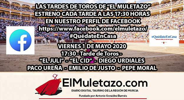Para que las tardes de confinamiento les sean más agradables en esta segunda etapa del estado de alarma decretado por el Gobierno de España, ElMuletazo.com, como ha venido haciendo desde mediados del mes de marzo, les ofrece cada tarde una corrida de toros compuesta por seis faenas históricas de todos los tiempos. Algo que le hemos llamado la feria del #QuédateEnCasa y que la pueden seguir únicamente en nuestro perfil del Facebook, desde las 17:30 horas.