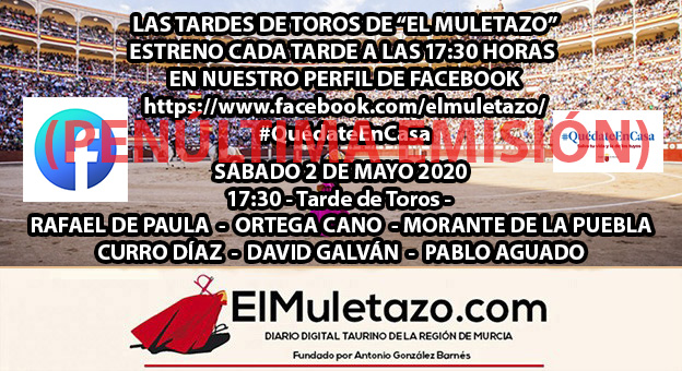 Para que las tardes de confinamiento les sean más agradables en esta segunda etapa del estado de alarma decretado por el Gobierno de España, ElMuletazo.com, como ha venido haciendo desde mediados del mes de marzo, les ofrece cada tarde una corrida de toros compuesta por seis faenas históricas de todos los tiempos. Algo que le hemos llamado la feria del #QuédateEnCasa y que la pueden seguir únicamente en nuestro perfil del Facebook, desde las 17:30 horas.