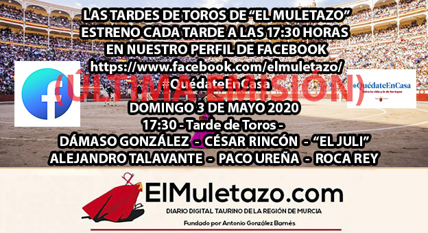 Para que las tardes de confinamiento les sean más agradables en esta segunda etapa del estado de alarma decretado por el Gobierno de España, ElMuletazo.com, como ha venido haciendo desde mediados del mes de marzo, les ofrece cada tarde una corrida de toros compuesta por seis faenas históricas de todos los tiempos. Algo que le hemos llamado la feria del #QuédateEnCasa y que la pueden seguir únicamente en nuestro perfil del Facebook, desde las 17:30 horas.