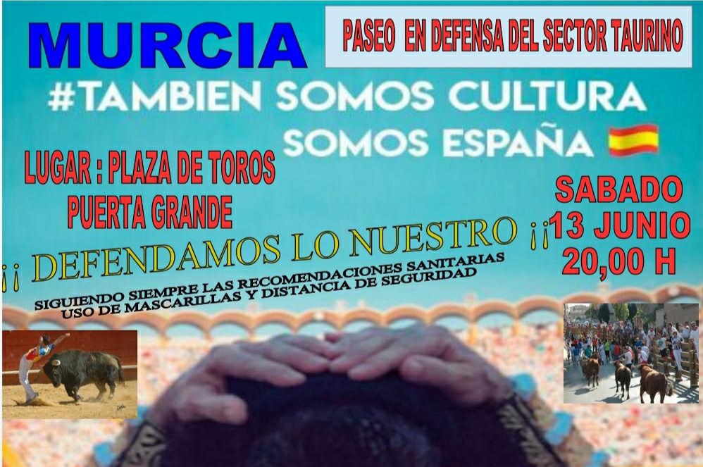 Tras la anulación por recomendación del Ministerio de Sanidad del “Paseo por la reivindicación del maltrato del Gobierno a los profesionales taurinos” programado para el pasado domingo 24 de mayo en Murcia, un grupo de profesionales del sector de nuestra Región ha vuelto a convocar el paseo pacífico por la tauromaquia bajo el lema “También somos cultura ¡Defendamos lo nuestro!” para el próximo sábado, 13 de junio, a las ocho de la tarde. El inicio del mismo se producirá en la Puerta Grande de la Plaza de toros de Murcia y en el se seguirán rigurosamente las recomendaciones sanitarias.