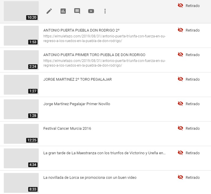 ElMuletazo.com también viene sufriendo la censura de YouTube desde hace varios años, retirando sin motivo alguno los vídeos que se suben, solo amparándose en sus términos y condiciones que marginan al toreo como cultura.