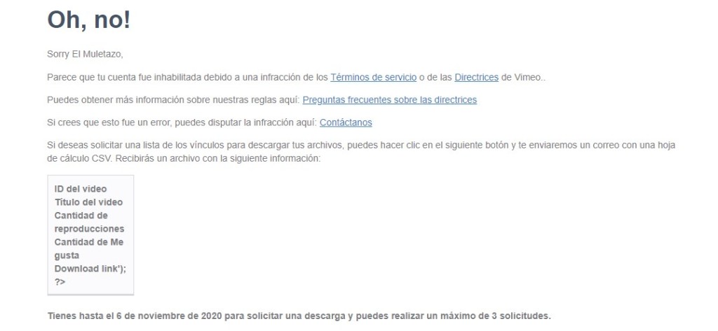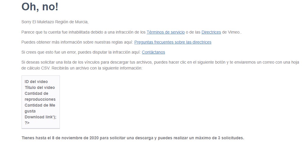 La plataforma de vídeos online “Vimeo”, con la que trabajaba este medio para ofrecerles la información en la web, ha inhabilitado las dos cuentas que teníamos habilitadas para ello, bajo los nombre de El Muletazo y El Muletazo Región de Murcia.