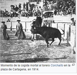 La de Corchaito bien merece una historia taurómaca particular, pero como adelanto, decirles, que ese 9 de agosto, se lidiaron toros de Félix Gómez, de Colmenar. Corchaíto, que había escuchado muchos aplausos por su valentía al capear de capote y muleta al segundo, le dio una gran estocada. Volvió a levantarse el toro y Fermín volvió a entrar a matar muy valiente y exponiendo mucho, cuando fue cogido por la ingle y elevado a gran altura. Ya en el suelo el toro le dio otra cornada en el pecho, que le atravesó el corazón. Conducido el diestro a la enfermería, cuando llegó, era ya cadáver. La muerte de este torero honrado y cabal, ocasionó un profundo pesar a la ciudad.