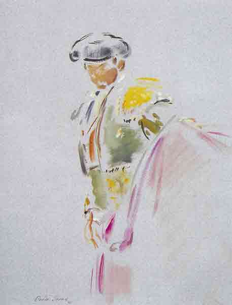 Las acuarelas ilustran tanto el momento del paseíllo como el de dirigir la lidia con el capote de brega. “La tauromaquia tiene un interés muy grande para mí desde el principio, y sobre todo a raíz de conocer personalmente a algunos de los mejores toreros que ha habido”, expresa Serna que se declara seguidor de Rafael de Paula.