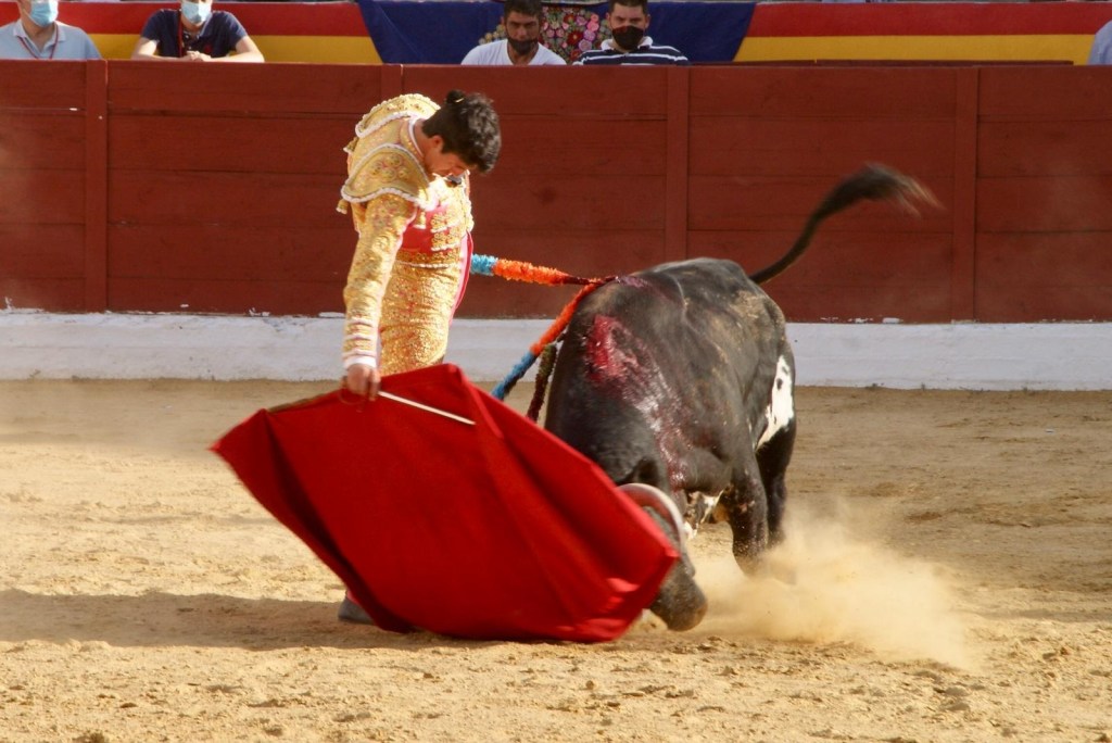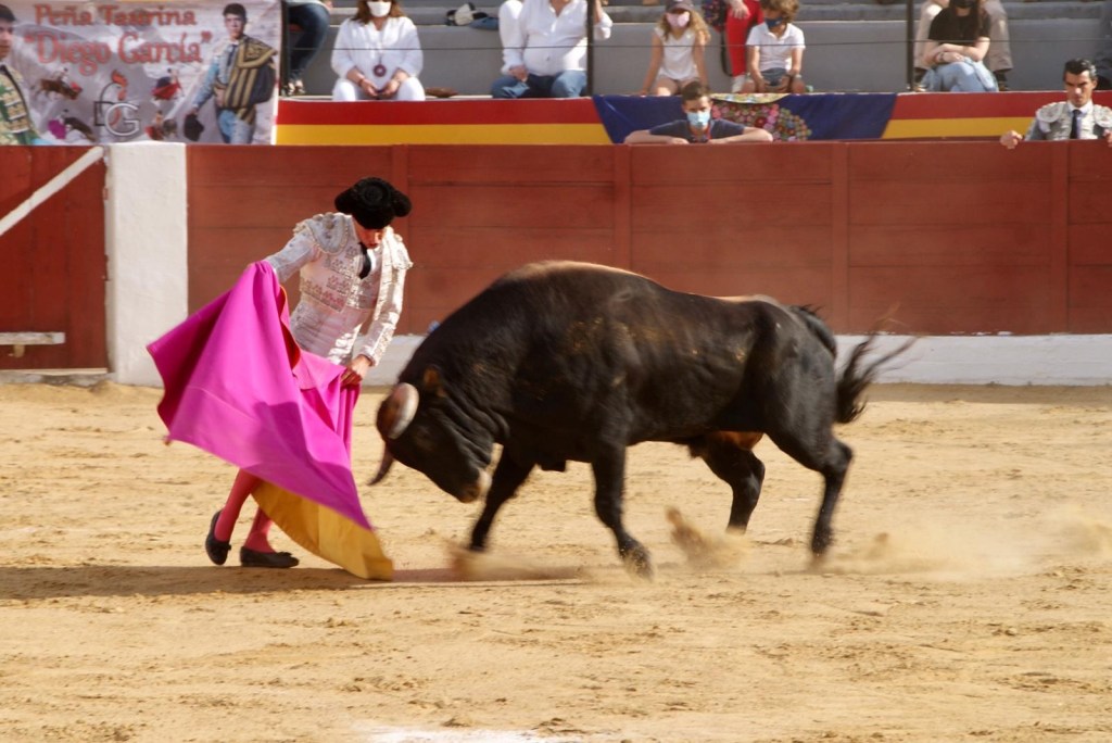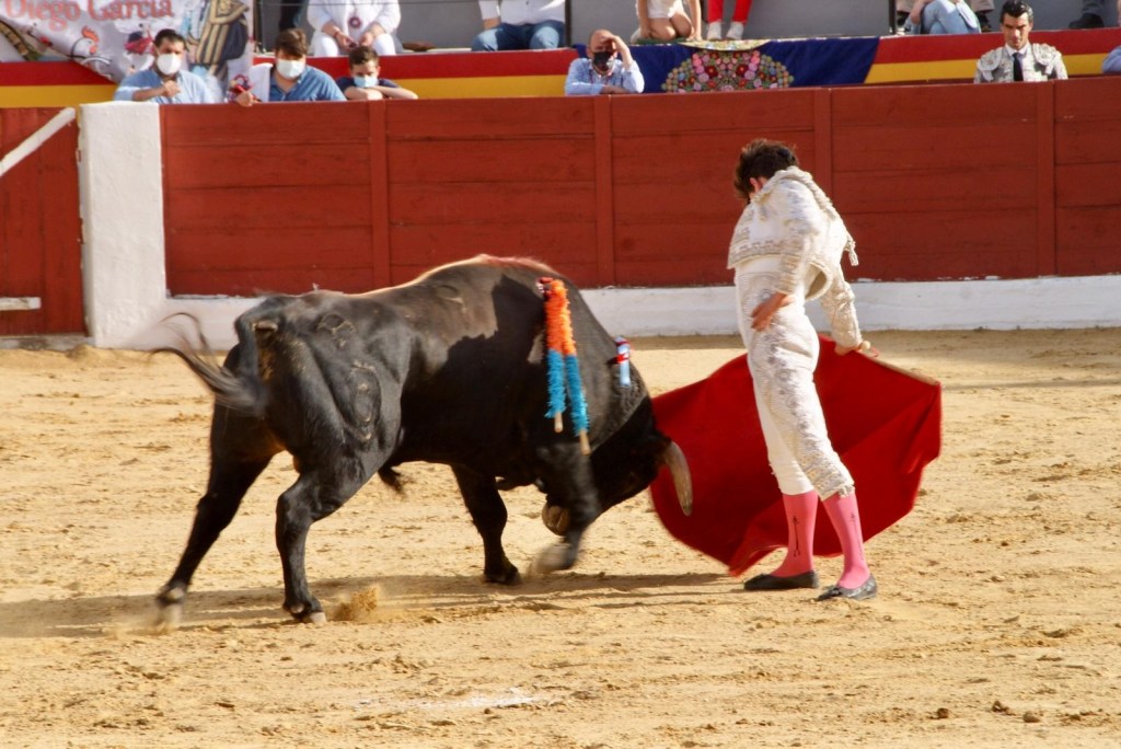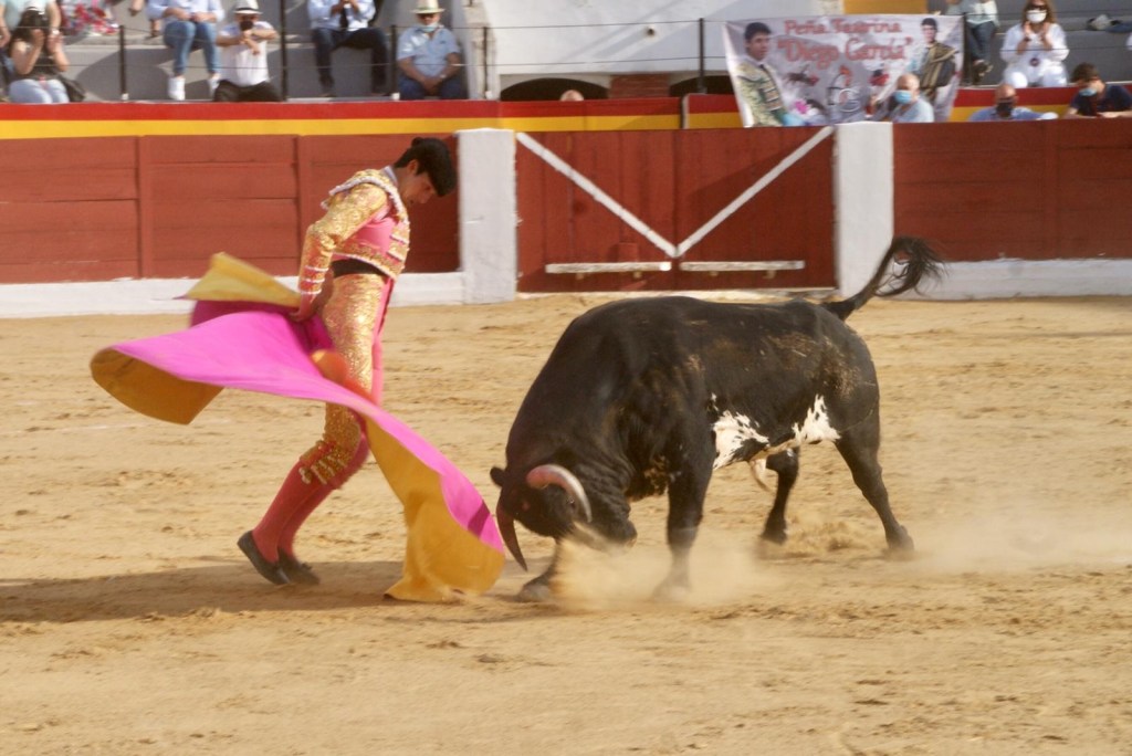 Diego García se metió al público en el bolsillo desde el primer momento. El de San Sebastián de los Reyes saludó al tercero con una larga cambiada seguida de capotazos ejecutados con garra. La gente apreció pronto sus ganas de agradar y trató al madrileño como si fuera de la tierra. El animal de Toros de El Capricho tuvo buen son y movilidad en la muleta, en parte motivado por la buena brega que le realizó el subalterno “El Ruso”. García aprovechó las buenas condiciones del animal e instrumentó una faena rotunda por los dos pitones, llevando al novillo largo y templado. Terminó pegándose el arrimón para terminar de dar muestra que su empeño por ser torero no es de broma. Con la espada perdió los trofeos. Lo sacaron a saludar como premio de consolación a lo realizado.