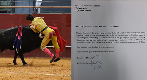“¡No sabe nada!”, pienso. Le mando el parte y lee la crónica de una guerra firmada por un cirujano: “Durante el desarrollo del festejo y en el tercer novillo ha sido atendido el novillero Manuel Perera Matos de 19 años de edad, que presenta una herida por cuerno de toro en fosa iliaca izquierda con un trayecto ascendente y hacia afuera de unos 30 cm que desgarra musculatura de pared abdominal; otro trayecto hacia arriba y adentro que penetra en cavidad peritoneal con evisceración de asas intestinales y arrancamiento de epiplón alcanzando una extensión de 40 cm. Bajo anestesia general se interviene quirúrgicamente. Se traslada a Hospital de Nuestra Señora del Rosario. Pronóstico muy grave”.