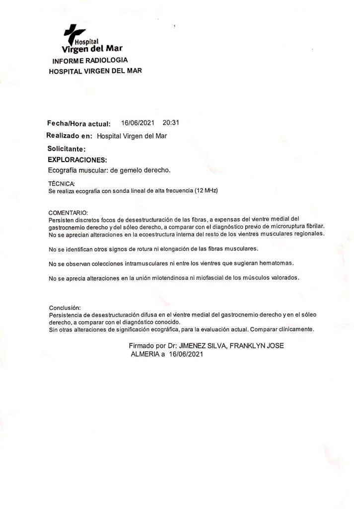 Pese a intentar acortar estos días los plazos de recuperación de la lesión que se le descubrió el pasado 11 de junio, y que según la prescripción de los médicos necesitaba de al menos 10 días de reposo absoluto, la última ecografía que le ha realizado el Dr. Jiménez Silva en el Hospital Virgen del Mar de Almería indica que “persisten discretos focos de destructuración de fibras difusa en el vientre medial del gastrocnemio derecho y en el sóleo derecho.”