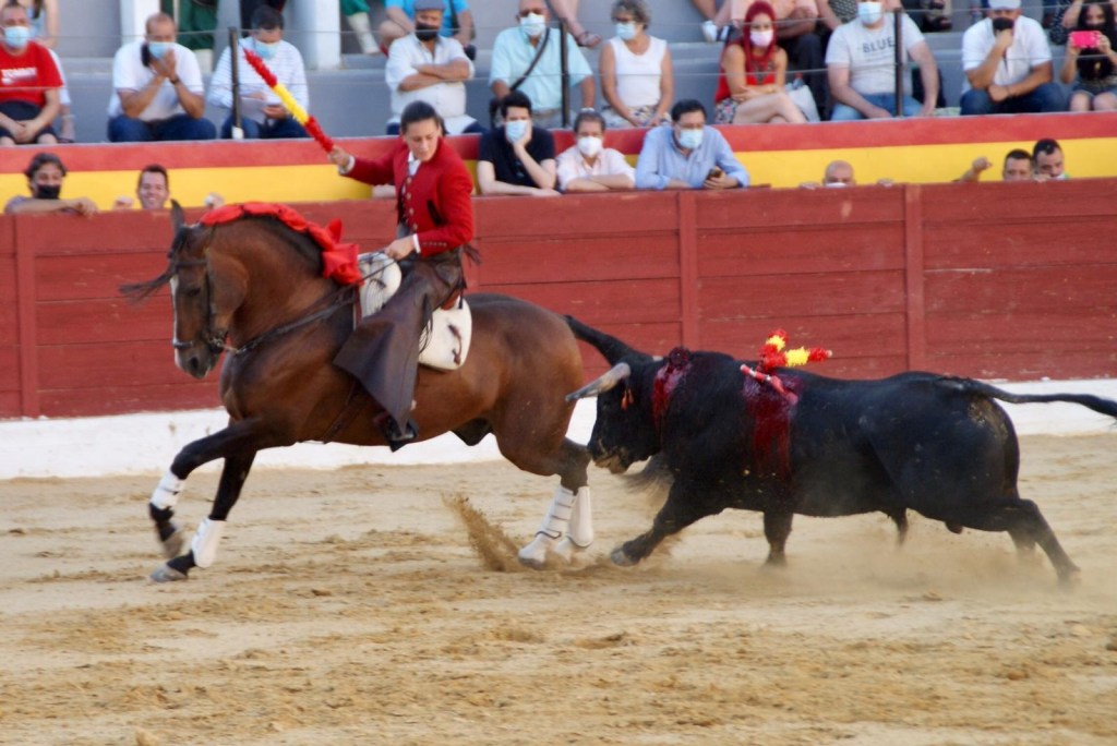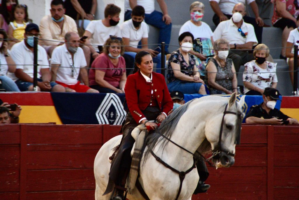 La amazona estuvo voluntariosa con el primer novillo del festejo. Tras los nervios del inicio, donde puso dos rejones de castigo traseros, se centró más con las banderillas, donde consiguió conectar con un público que vio como poco a poco iba cogiendo más confianza. Más relajada, y con el apoyo del público que la notó algo afligida, cogió moral y terminó poniendo alguna banderilla con acierto. Fue efectiva a la hora de usar la hoja de peral y paseó dos generosas orejas que un cariñoso público pidió con insistencia a la presidencia.