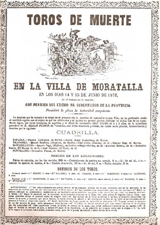 Cuando en 1854, un grupo de aficionados -los hermanos Aldrete- pensaron que sería bueno, como símbolo de modernidad, que Moratalla, además de la corrida a la antigua, podía integrarse en la moderna, se lanzaron a la aventura de construir una plaza de toros. Para ello eligieron los ejidos del hospital de San Camilo, con la intención de celebrar también algunos festejos en beneficio de tan altruista institución. Según las crónicas, su falta de experiencia y su confianza en algunos “expertos”, les llevaron al más absoluto fracaso.