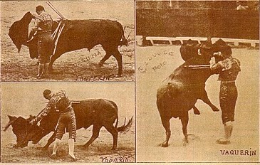 Vaquerín y Rafael Moreno eran los encargados de la lidia y muerte de cuatro novillos de la ganadería de Idelfonso Gómez de Madrid, que estaban bien puestos de pitones, tenían muchos kilos y dicen que algunos más de cinco años. Novillos (?) para ser lidiados en corridas de toros y en una plaza de ruedo mayor.