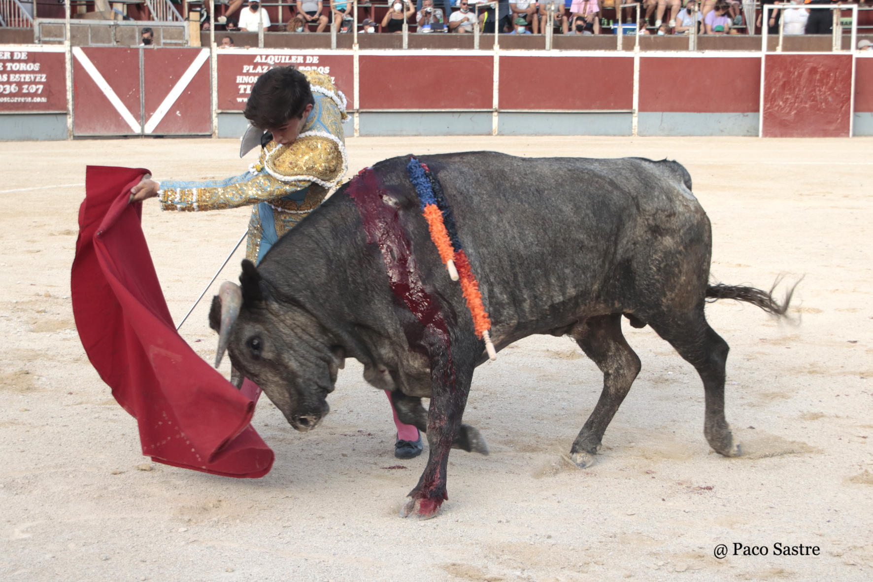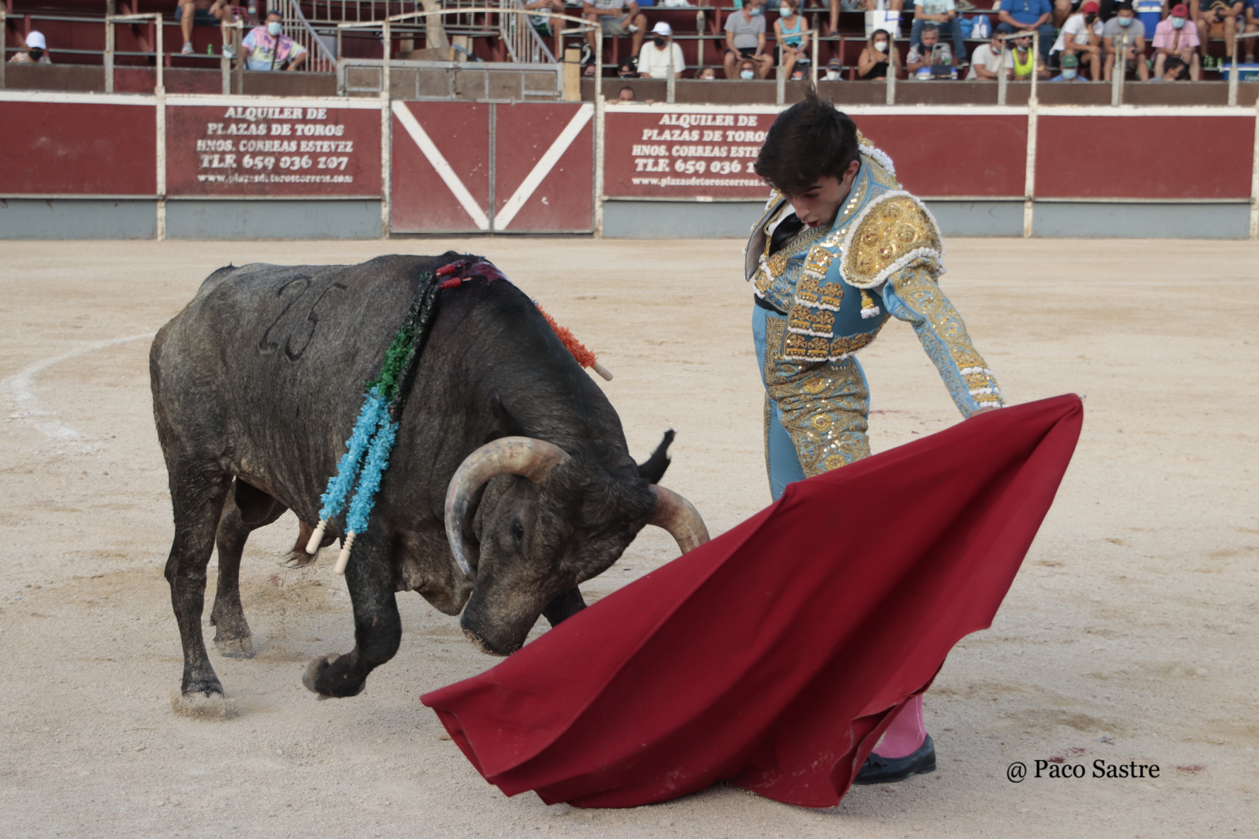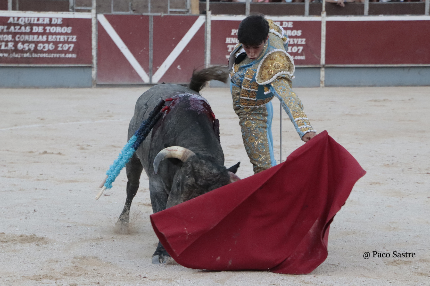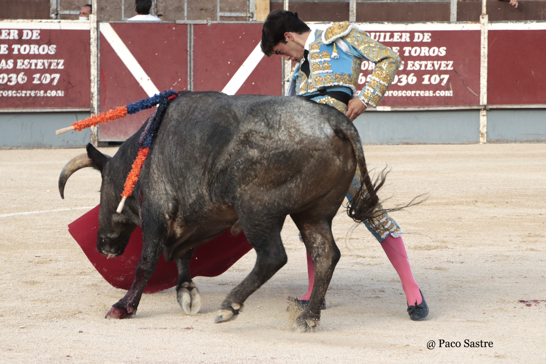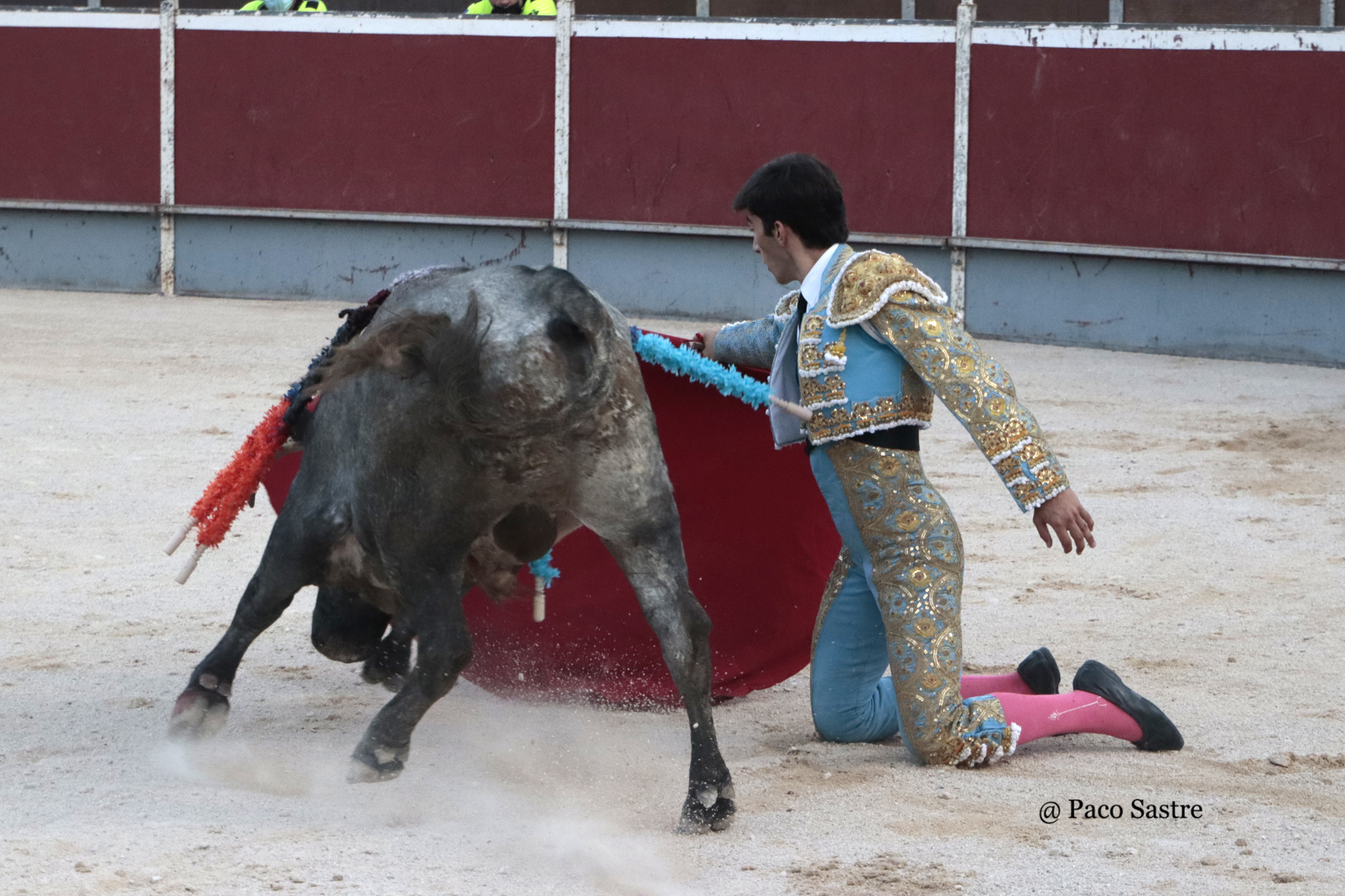 Torear, lo que se dice torear de verdad, pues más bien poco, esforzado eso sí, pero del montón. Lo que le distingue es la fuerza arrolladora de saber conquistar a los públicos. Garra, coraje, y lo que es importante cuando un novillero empieza, ¡¡Orejas!!.