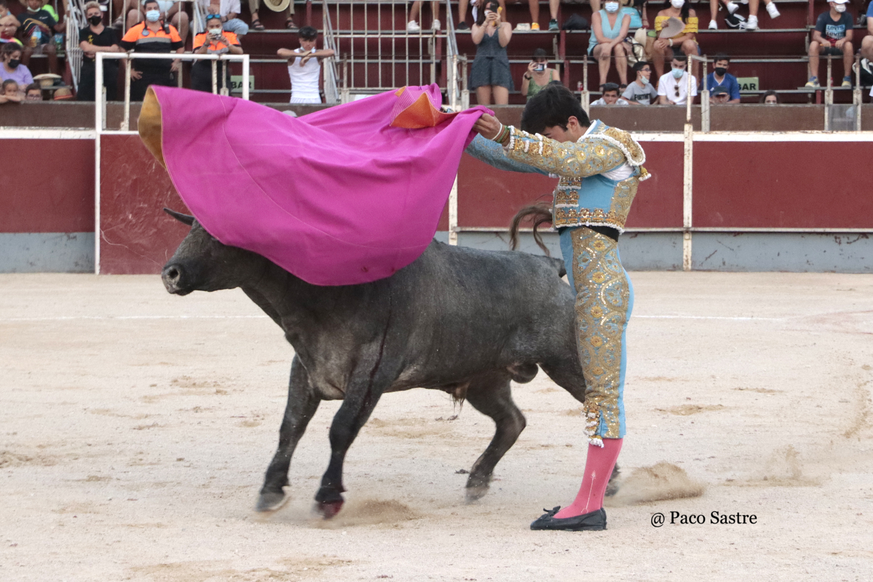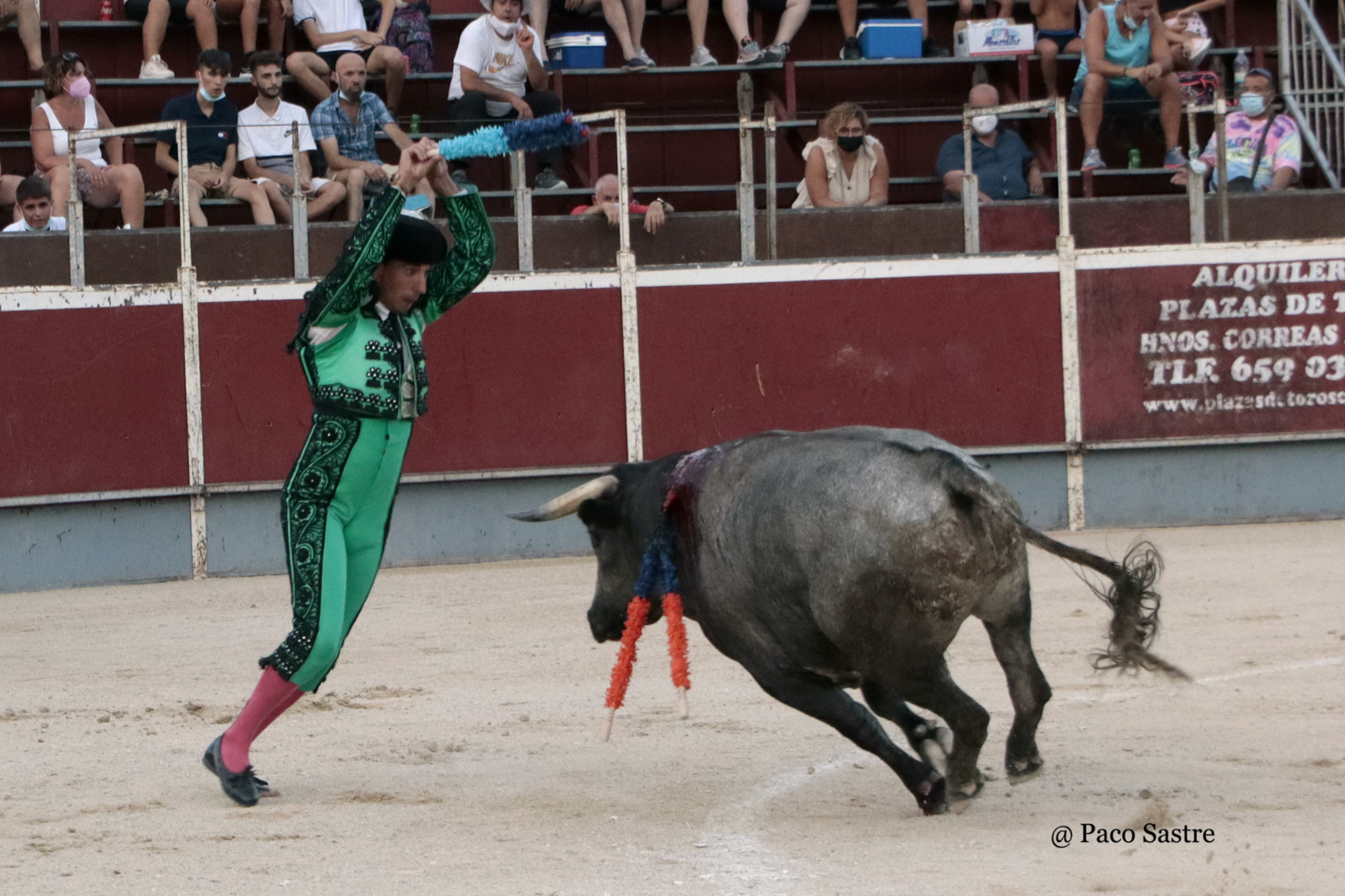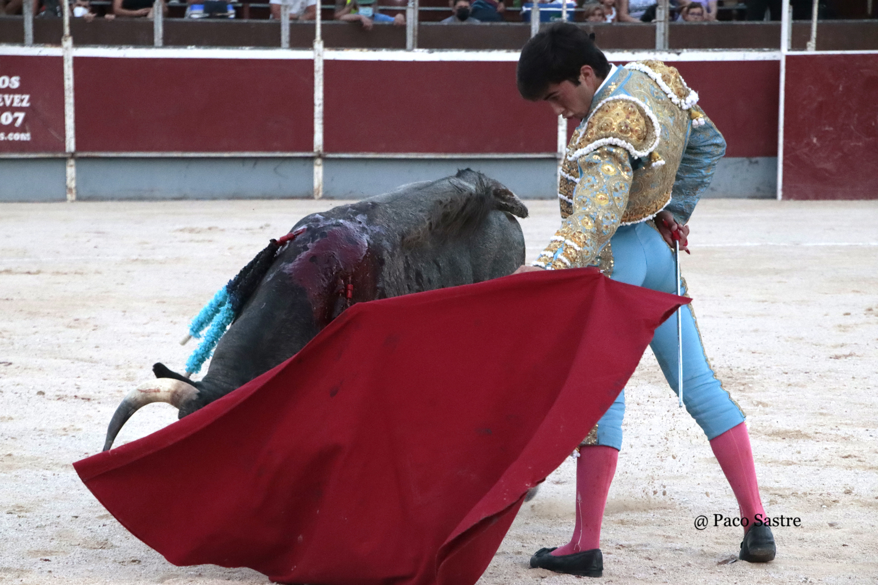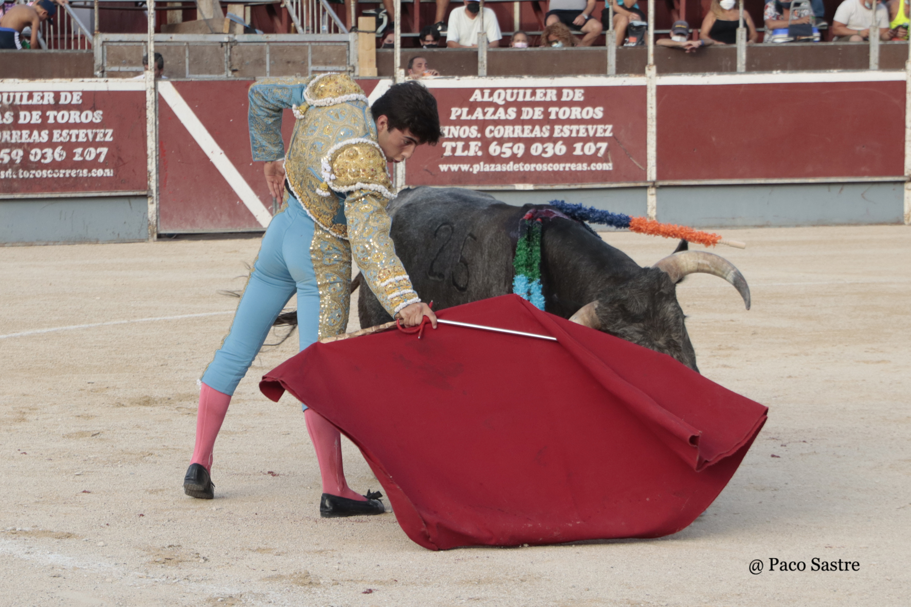 Torear, lo que se dice torear de verdad, pues más bien poco, esforzado eso sí, pero del montón. Lo que le distingue es la fuerza arrolladora de saber conquistar a los públicos. Garra, coraje, y lo que es importante cuando un novillero empieza, ¡¡Orejas!!.
