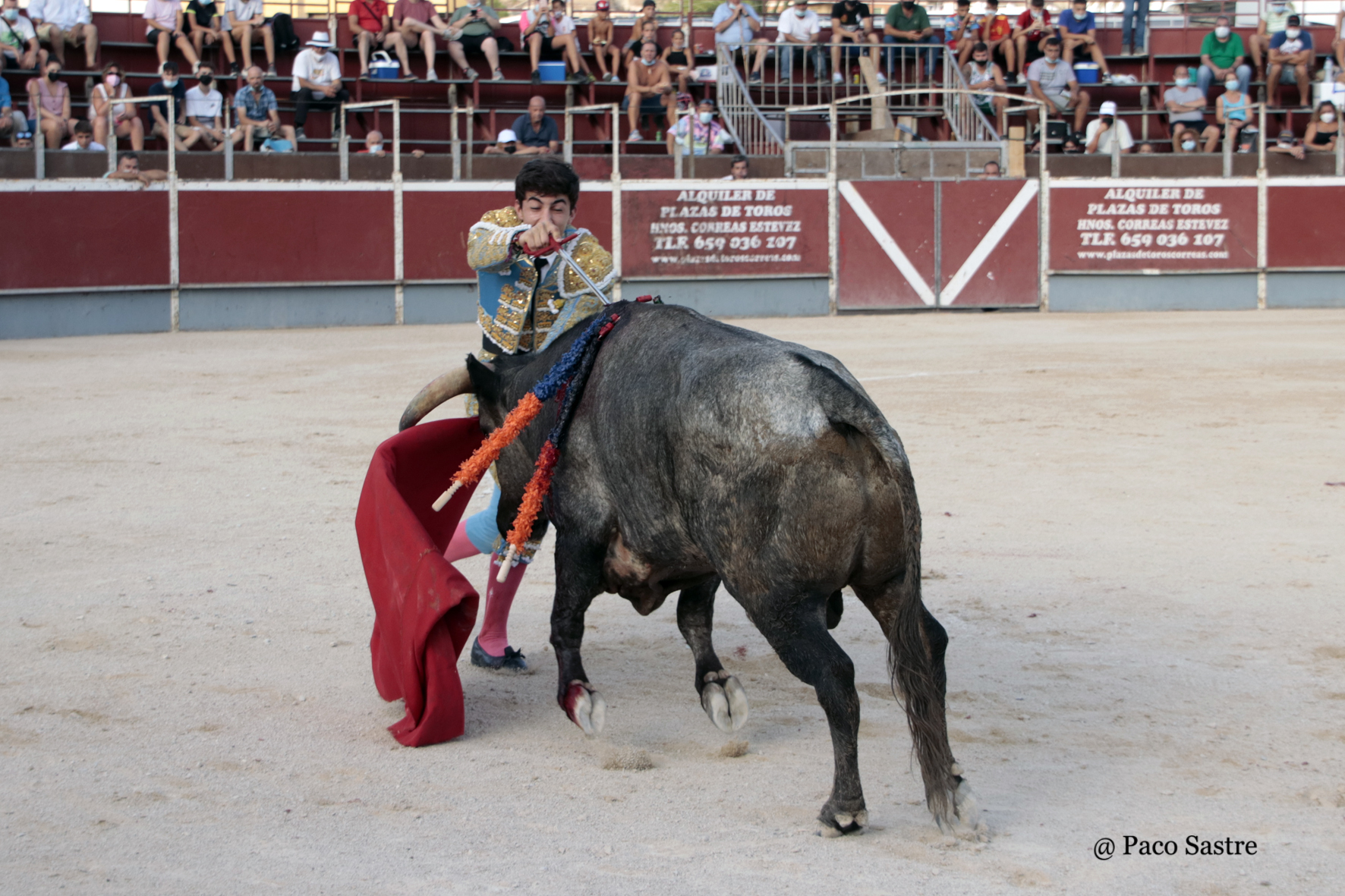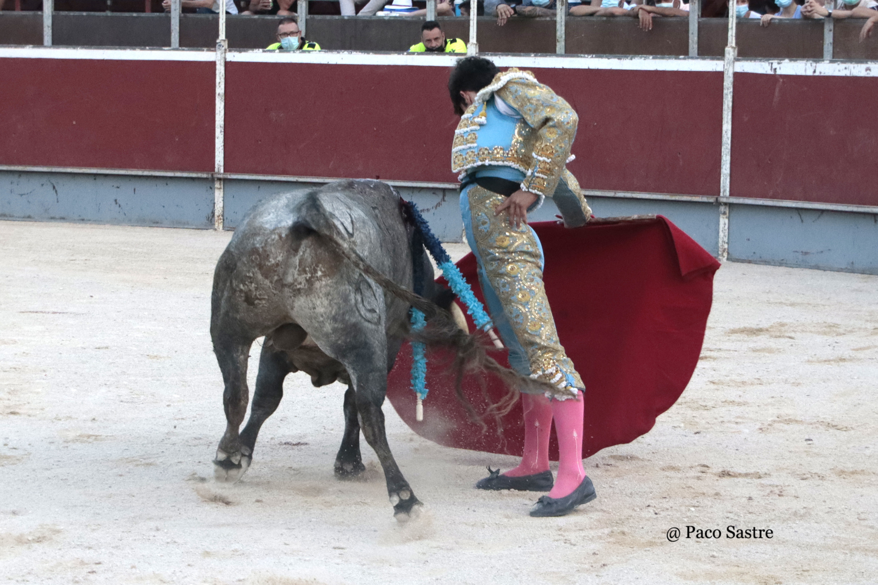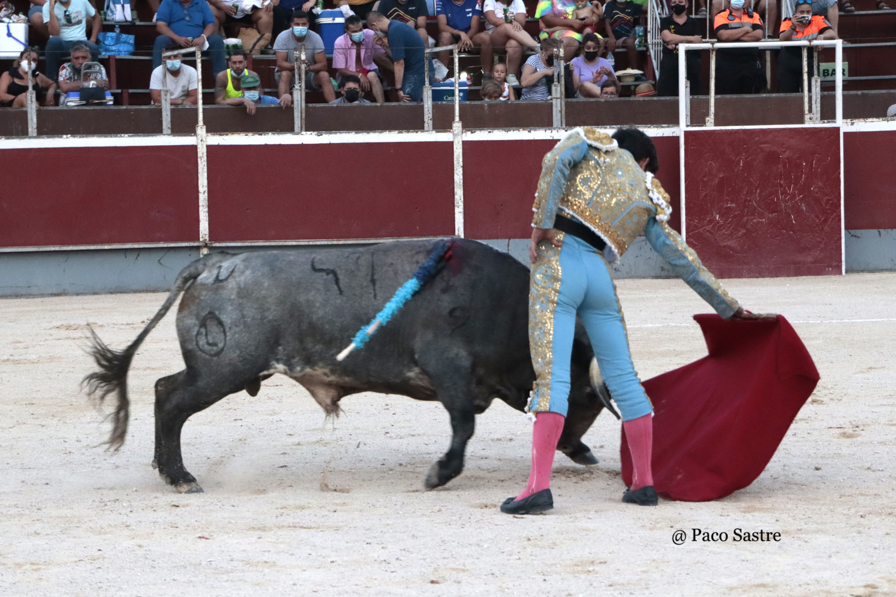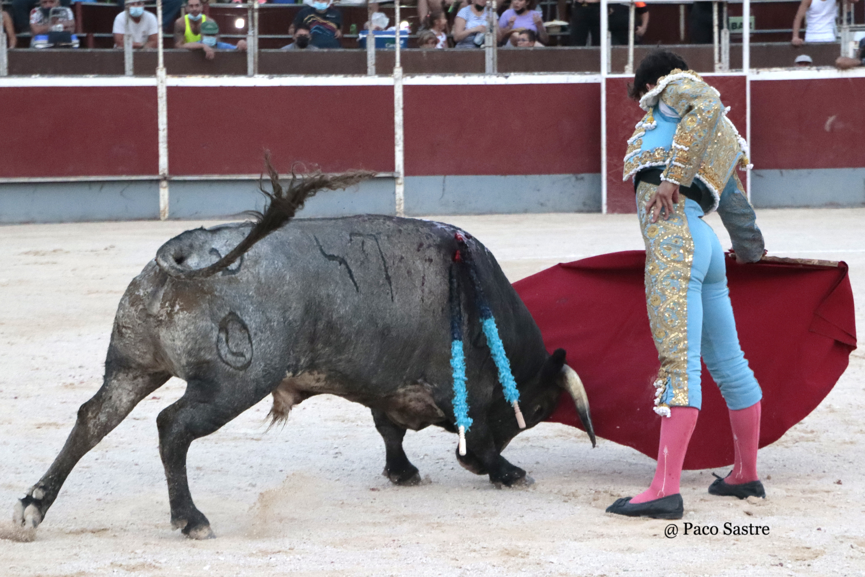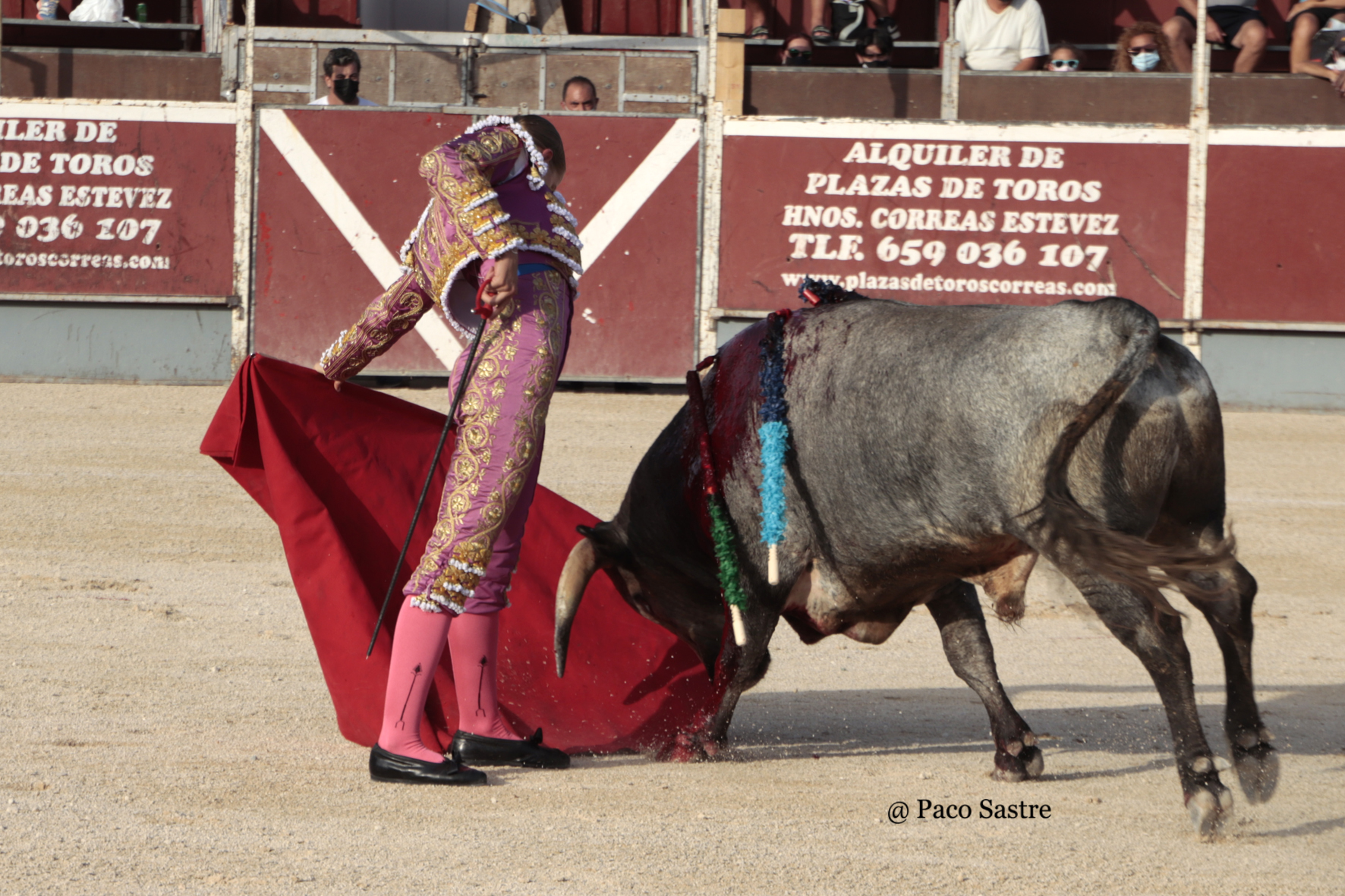 Torear, lo que se dice torear de verdad, pues más bien poco, esforzado eso sí, pero del montón. Lo que le distingue es la fuerza arrolladora de saber conquistar a los públicos. Garra, coraje, y lo que es importante cuando un novillero empieza, ¡¡Orejas!!.
