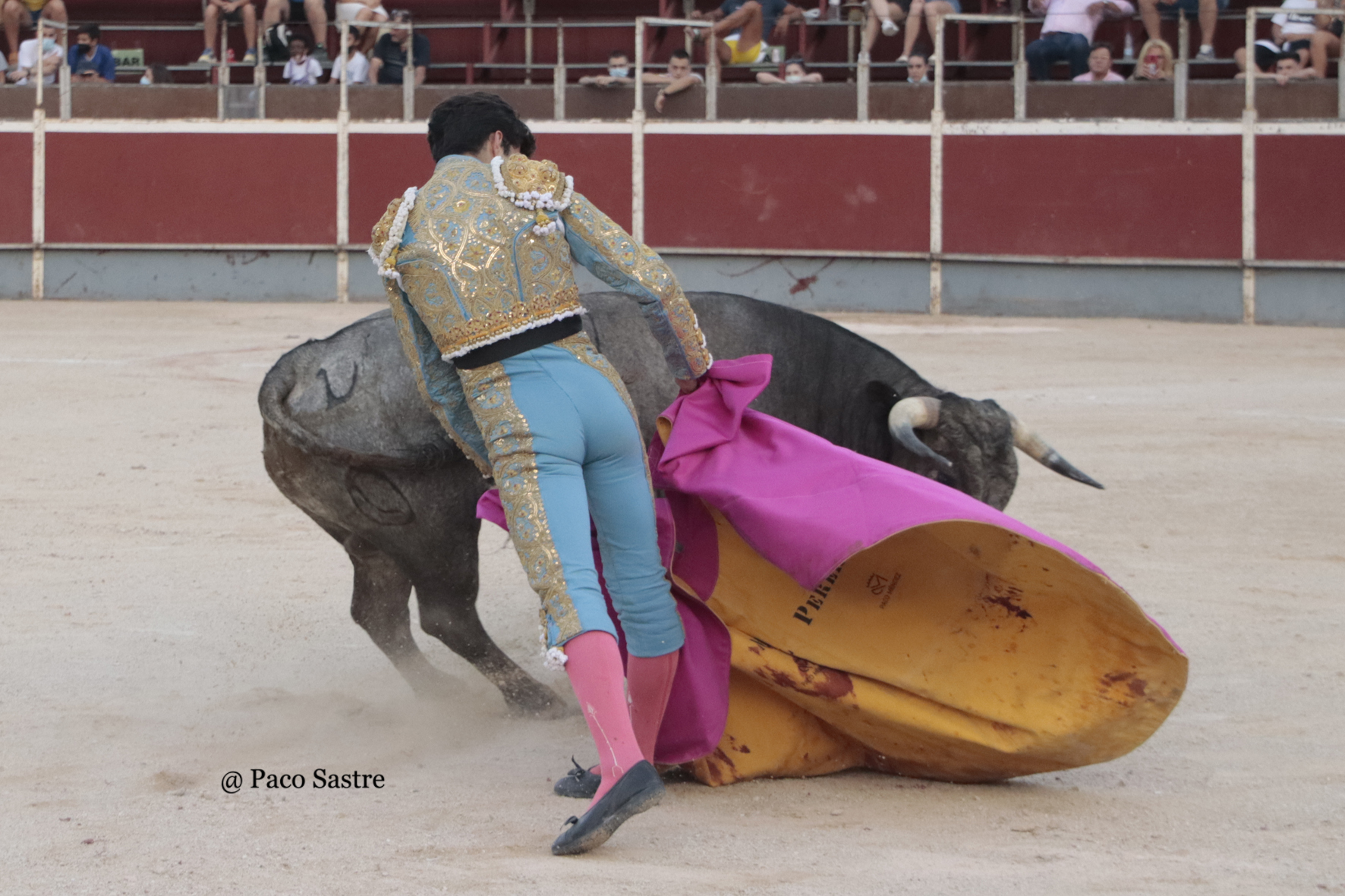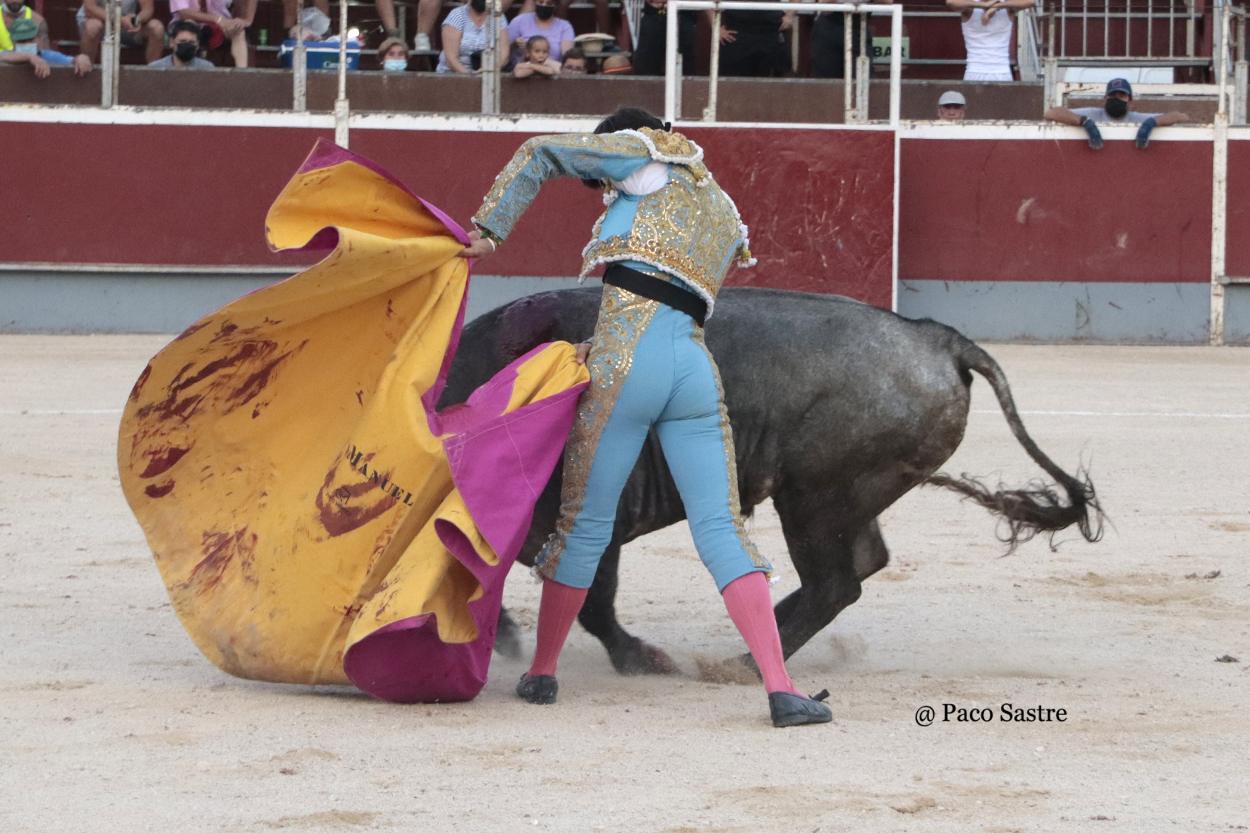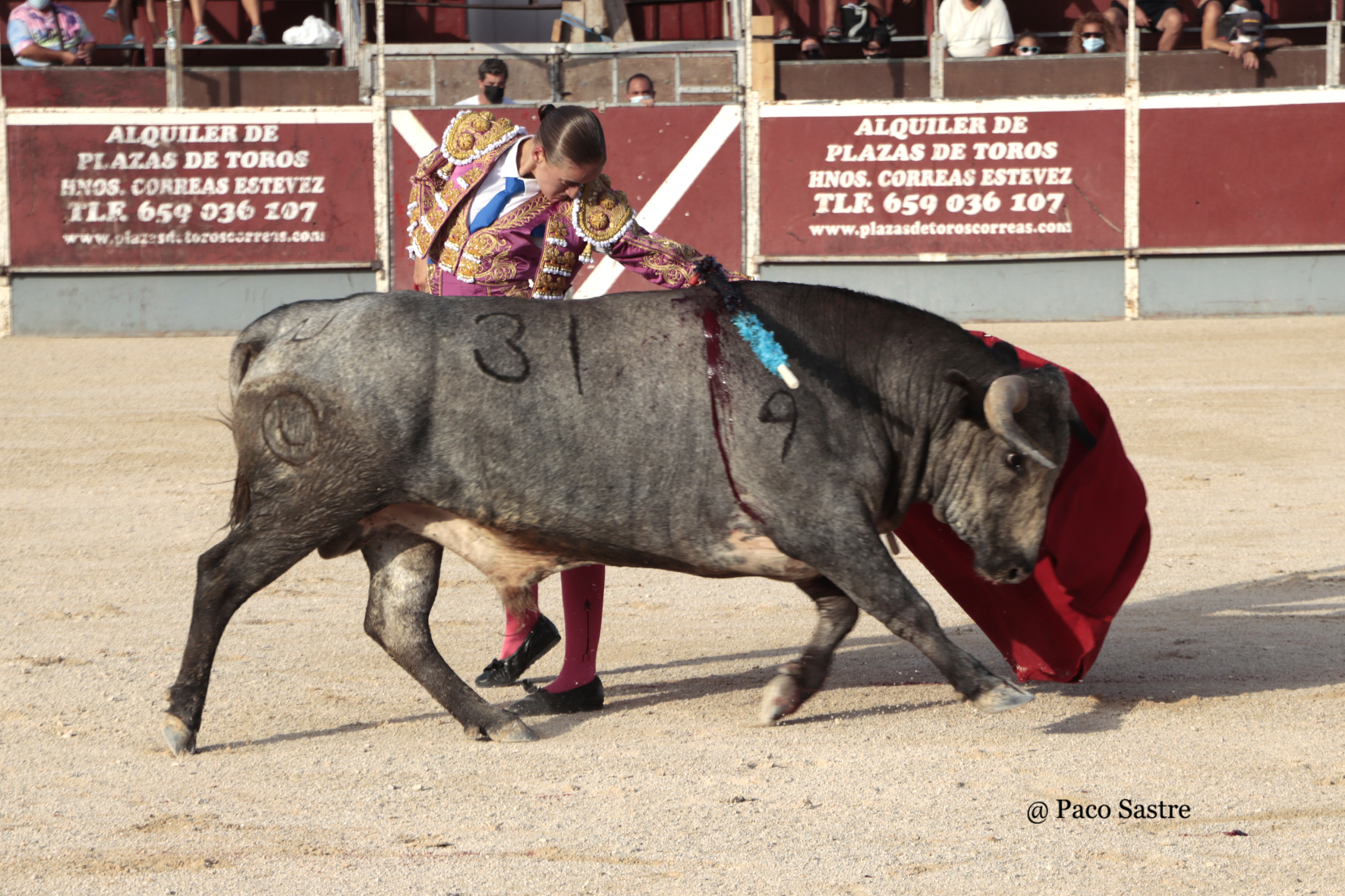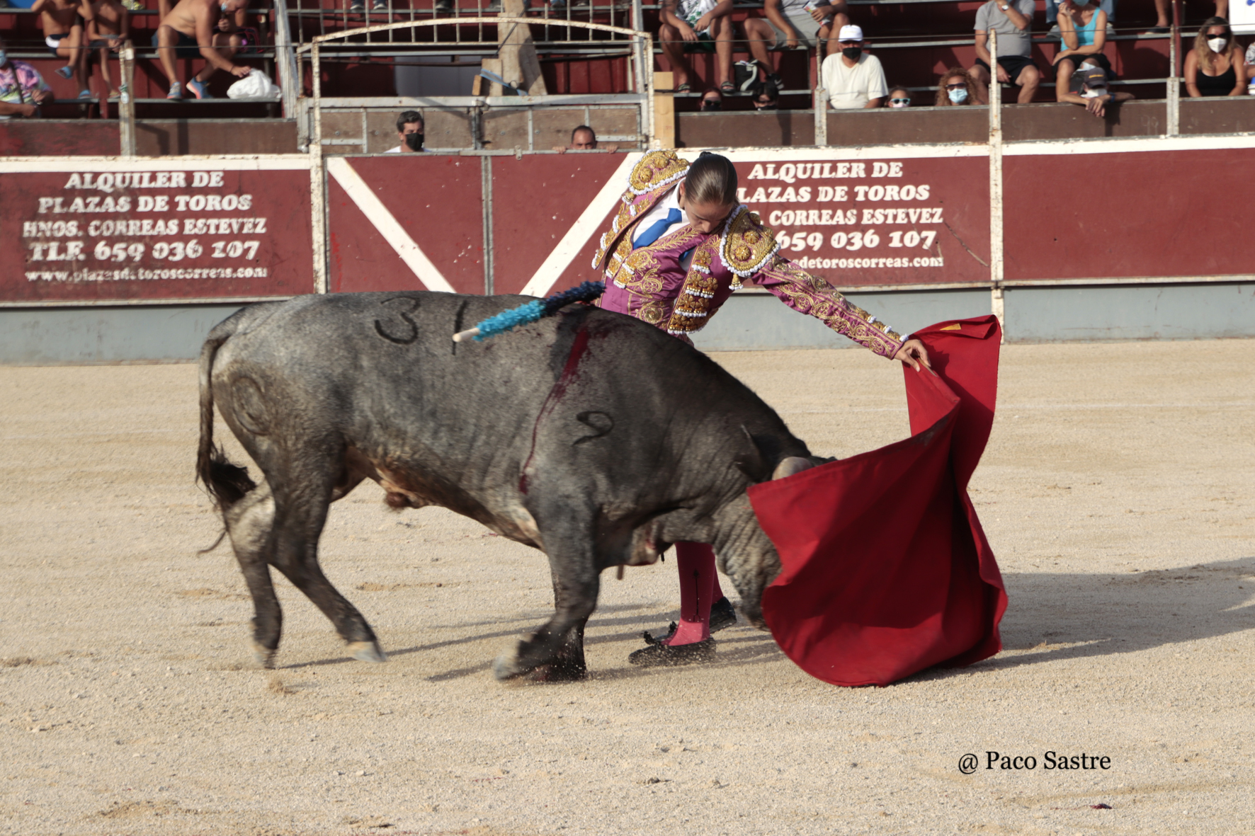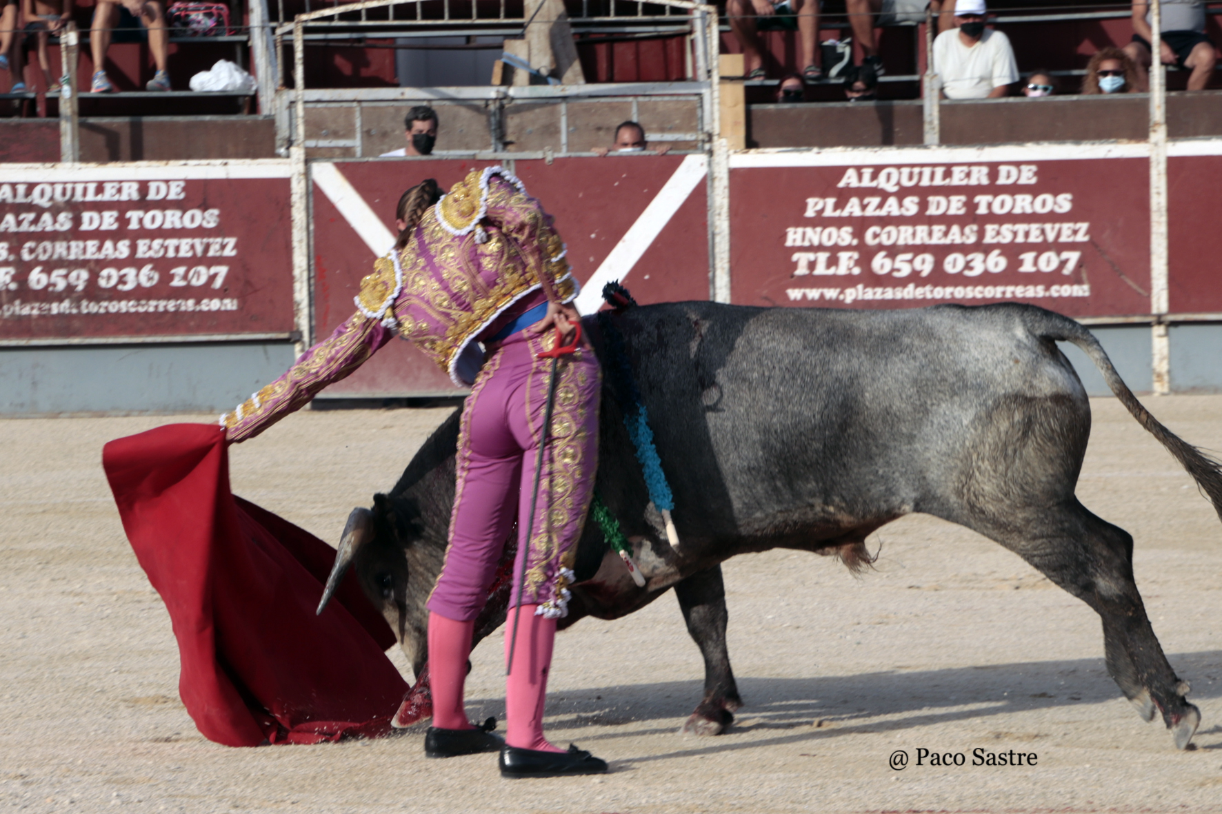 Torear, lo que se dice torear de verdad, pues más bien poco, esforzado eso sí, pero del montón. Lo que le distingue es la fuerza arrolladora de saber conquistar a los públicos. Garra, coraje, y lo que es importante cuando un novillero empieza, ¡¡Orejas!!.