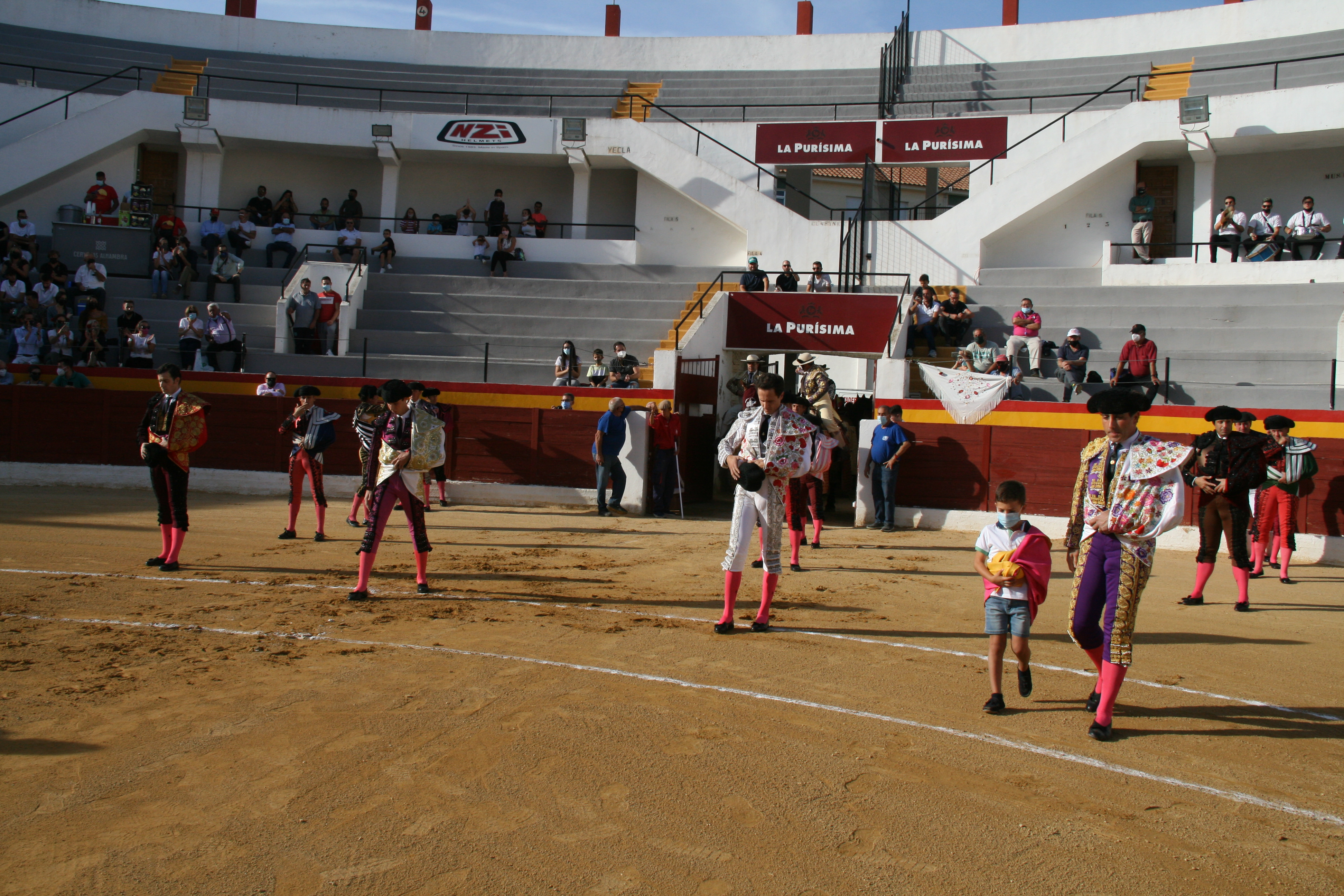 Con un minuto de silencio por las víctimas de la pandemia y tras sonar los acordes del himno nacional, comenzó la corrida de toros en la que comparecían los matadores Emilio Serna, Andrés Palacios y Diego Fera, completando el cartel el novillero sin picadores local Pedro Navarro, que inexplicablemente fue quien actuó en primer lugar. 8 reses en un festejo que duró casi 4 horas. Por orden cronológico: