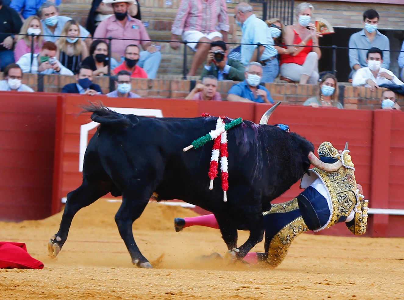 Y cuando finalizó el festejo se fue a la enfermería con un bulto en el muslo derecho, del que no se había quejado. Tras la exploración del equipo de Doctor Octavio Mulet Zayas, cirujano jefe de la plaza de toros de Sevilla, se le descartó la cornada interna, apreciándole «contusión en la cara interna del muslo derecho y varetazo corrido en la cara anterior del muslo izquierdo. Pronóstico leve«.