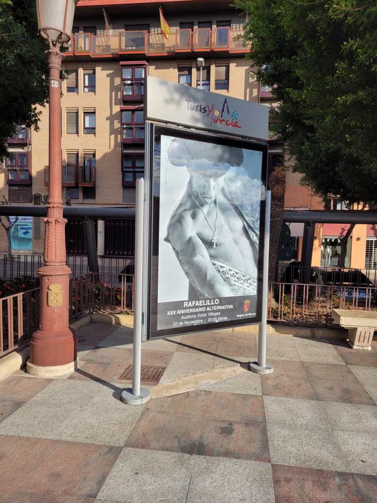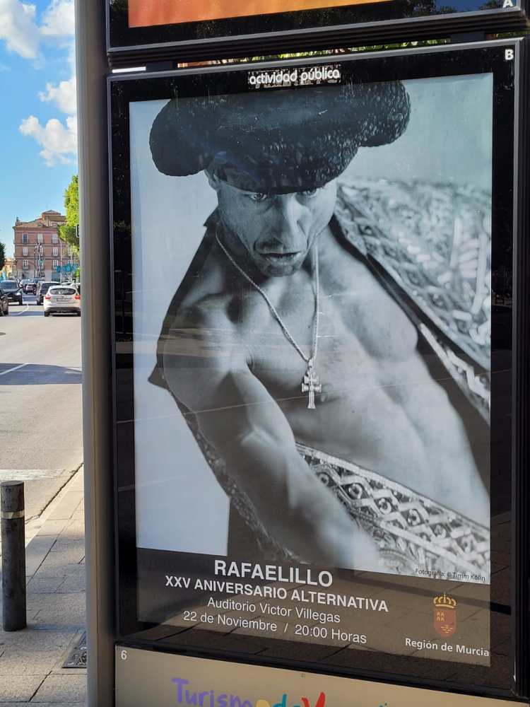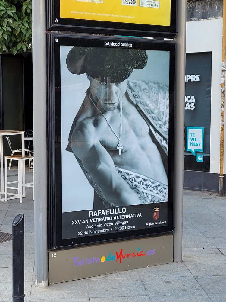 Rafaelillo se ha instalado en todos los rincones de Murcia. Las principales avenidas y zonas céntricas de la capital murciana han amanecido este martes con una espectacular e icónica imagen de Rafaelillo, antesala del gran homenaje que recibirá el torero el próximo 22 de noviembre, organizado por el Gobierno Regional que preside Fernando López Miras.
