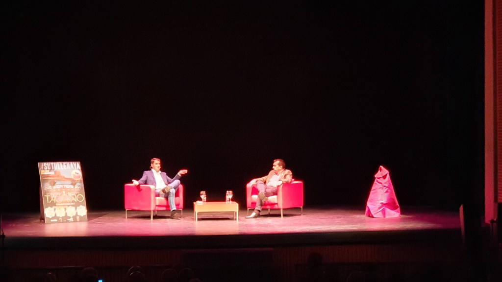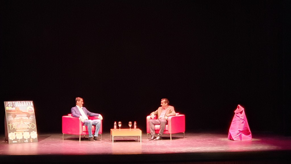 En esta ocasión el protagonista de la charla taurina fue el carismático torero gaditano Jesús Janeiro Bazán “Jesulín de Ubrique. El mediático personaje hizo las delicias del público asistente contando sus vivencias en el mundo del toro y en la vida. Como si de una pieza teatral se tratara, la plática tuvo comedia, drama, tragedia y un sensacional monólogo del de Ubrique que provocó momentos desternillantes entre el público que llenó el patio de butacas del imponente teatro lorquino.