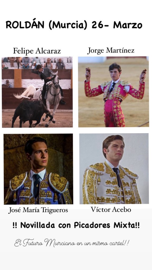 La pedanía pachequera de Roldán (Murcia), será el lugar en el que se podrá admirar el gran nivel de 4 de las más firmes promesas de la novillería regional. Un cartel 100% murciano que cuenta con todos los atractivos, organizado por el empresario Pedro García, con la colaboración de la Comisión de Fiestas de Roldán, el Club Taurino de Torre Pacheco y el patrocinio de la Comunidad Autónoma de la Región de Murcia.