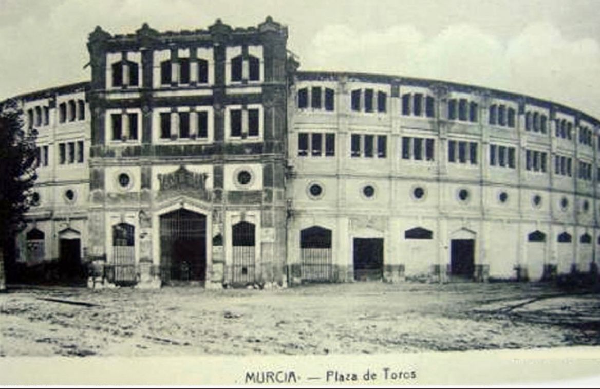 En esta primera entrada, Julián nos muestra una postal de la plaza de toros de Murcia, con su fachada original, tomada en 1890, pocos años después de su inauguración en 1887. Según nos relata, a la andanada y a la andanada interior se le llamaba longaniza, por el color anaranjado de los tablones que servían de asiento a los espectadores.