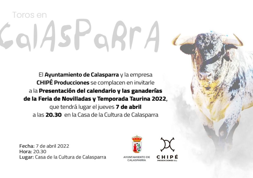 El Ayuntamiento de Calasparra y la empresa Chipé Producciones, que dirige Pedro Pérez ‘Chicote’, presentarán el próximo jueves, día 7 de abril, a las 20.30 horas, el calendario y las ganaderías de la Feria de Novilladas y Temporada Taurina de Calasparra.