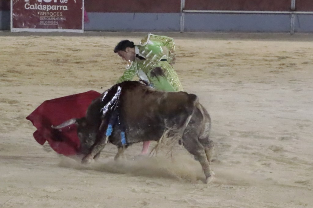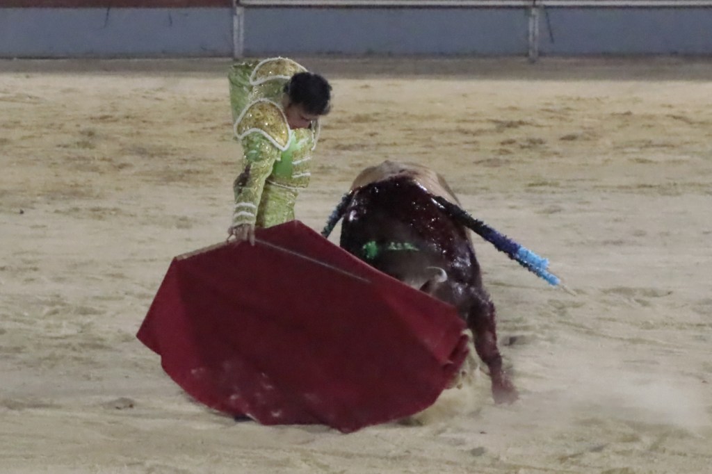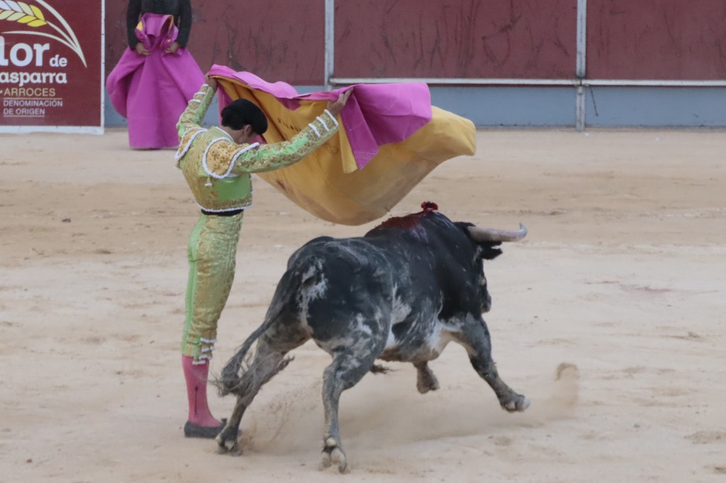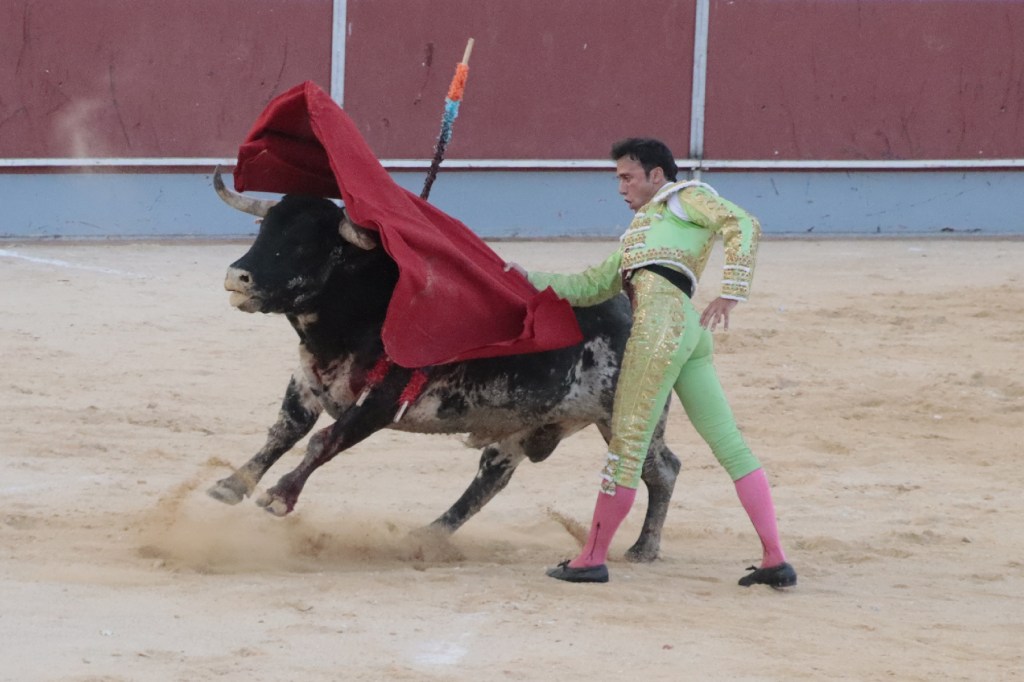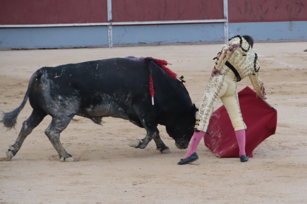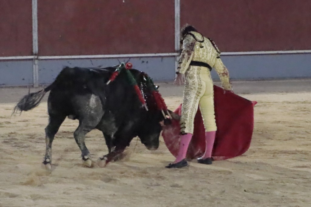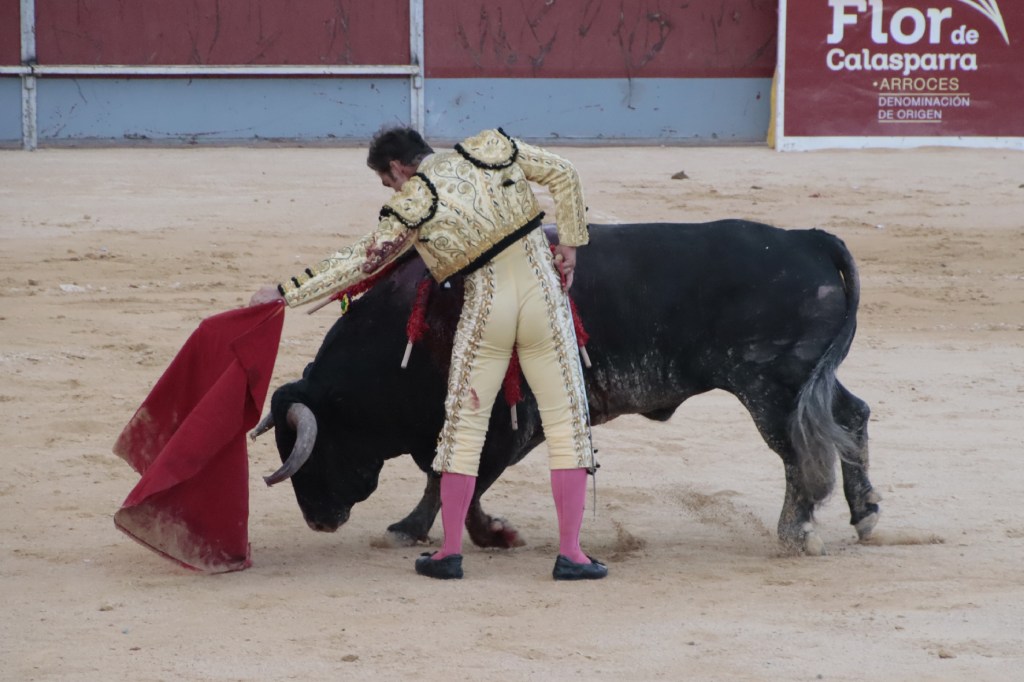Salió de la enfermería Filiberto con un aparatoso vendaje a matar al toro de Fuente Ymbro que cerraba la tarde. En el primer lance con el capote, se pudo observar que se encontraba muy mermado de condiciones. Aun así, hizo un esfuerzo continuando la lidia, con un toro exigente que puso en apuros a la cuadrilla. Tras brindar la muerte del animal al maestro Espartaco, sin enmendarse y pese a estar mermado de condiciones y al viento, se fue al mismo centro del ruedo para propinar una impactante serie por el pitón derecho sin mover los pies del suelo. Lo intentó por el izquierdo, dándose cuenta que no podía cargar la suerte por esa pierna. Sin tiempo de nada más, el toro se vino abajo y se fue “a tablas”, echándose incluso tras un pinchazo. Tras levantarlo el puntillero, tuvo Filiberto que usar el descabello en varias ocasiones. La inoportuna puesta en marcha de la megafonía para anunciar los premios, dejó en “silencio” lo que merecía la ovación como reconocimiento al esfuerzo.