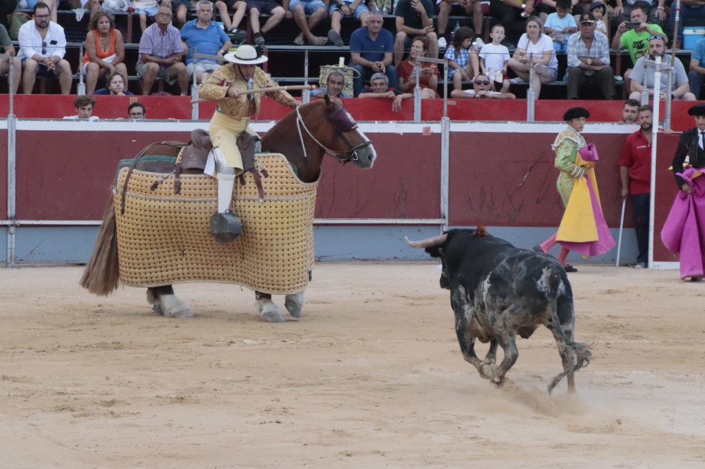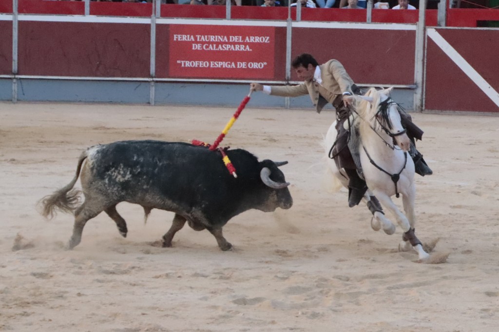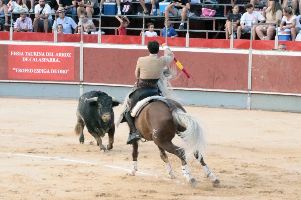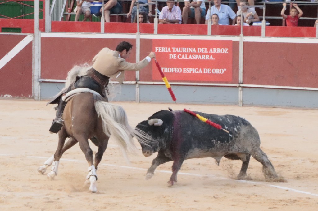 Abría cartel el rejoneador Andy Cartagena que debutaba en la Villa del Arroz. Ofreció dos faenas de distinto corte, más efectista y “moderna” la que abrió la tarde, y de corte más clásico la ejecutada en cuarto lugar en el orden de lidia. Muy seguro con todas las banderillas y vistoso en los adornos. Destacó un espectacular par de banderillas al cuarto. Acertó a la segunda en su primero cortando 1 oreja. En su segundo, se le fue la mano con un rejón muy caído, acertando la presidencia negando el segundo trofeo. 1 oreja y puerta grande.
