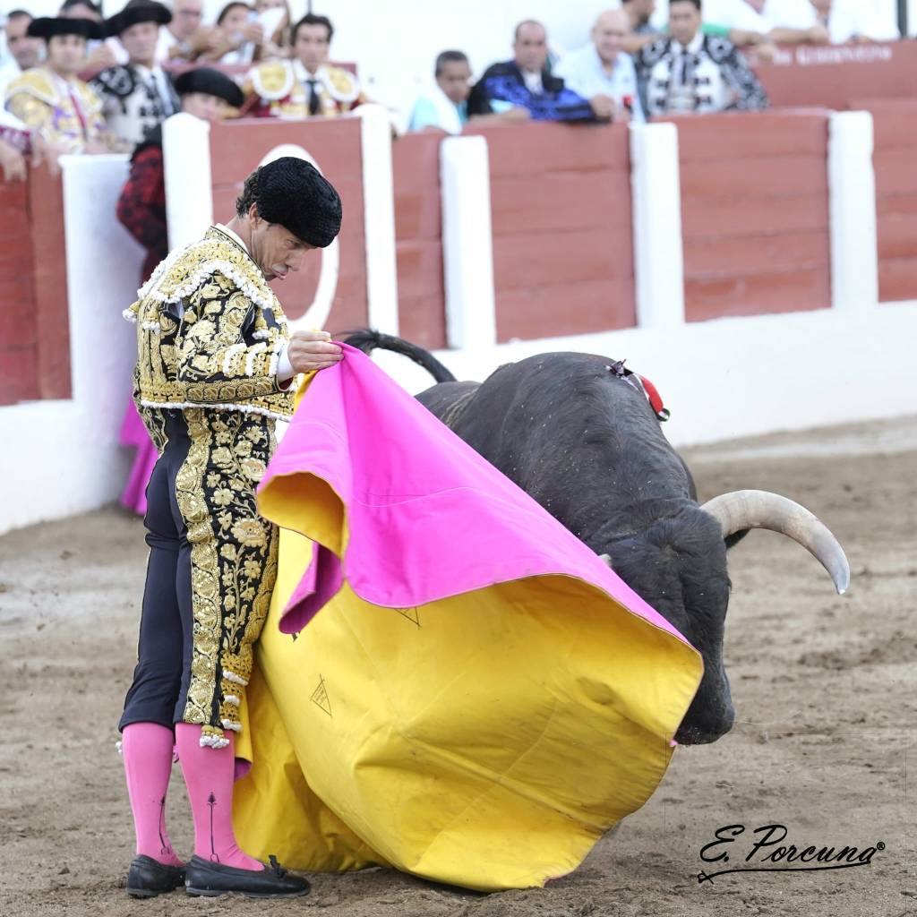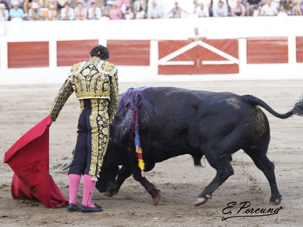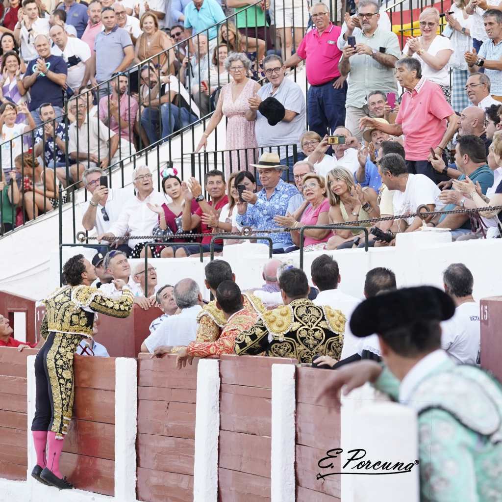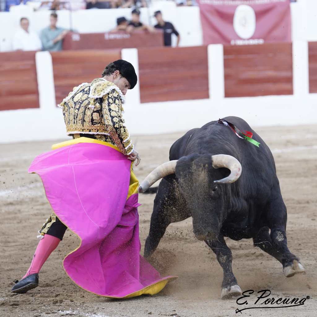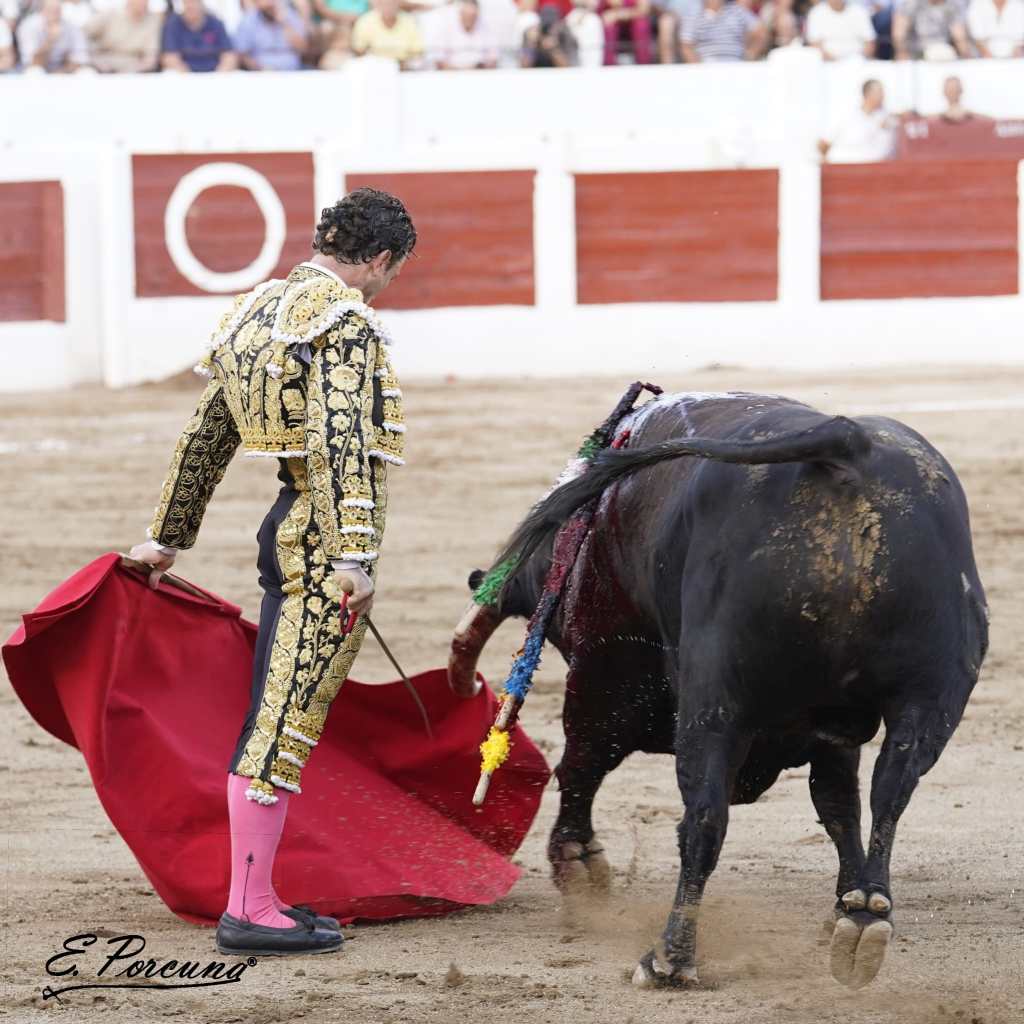 “Rafaelillo” formó una de las suyas con el primero de Miura de nombre “Zorrero”, un animal alto, pero escaso de Kilos, al que recibió con una larga cambiada de rodillas para después dejar verónicas largas y templadas. El de Miura mostró falta de fuerzas en el tercio de varas y se vino arriba en banderillas. El animal, con emoción y movilidad, era perfecto para que el catedrático de los de Lora del Río dictara lección. Y como no podía ser de otra manera, la dio. El murciano dejó series conseguidas por ambos pitones, donde además de garra sacó una estética sublime, dejando pases de entrega máxima y de relajo, mirando al tendido. Alargó la faena “Rafaelillo” tratando de exprimir las embestidas del toro. Puso de acuerdo a los aficionados y tras una estocada entera, un punto desprendida, que fue suficiente para atronar al animal, paseó la primera oreja de la tarde.