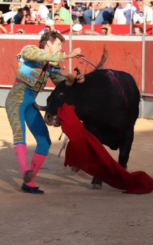 Para colmo, se tiró a matar como mandan los cánones, saliendo prendido por la zona escrotal. Se vivieron momentos de angustia porque se quedó colgado del pitón por una zona muy peligrosa. Tras comprobar que tenía todo el paquete masculino destrozado, no se amilanó. Se fue de nuevo a la cara del de Fuente Ymbro para rematar la obra. Y se tiró de nuevo de verdad, sin aliviarse, con el rostro lleno de dolor, con la estampa blanca del lógico mareo, pero también de satisfacción al ver que su enorme esfuerzo había tenido recompensa.