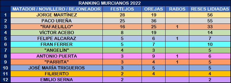 La gran novedad es que esta temporada 2022 el ranking lo encabeza un novillero con picadores. Un notición para el futuro taurino inmediato de la Región de Murcia, tan necesitado de novedades y alicientes, de competencia, de rivalidad. Uno de los nuestros, si la suerte quiere, los toros lo respetan y el sector no lo esconde y le da alas; está capacitado para plantarle cara a los nuevos nombres que ilusionan en el escalafón de matadores de toros, donde ingresará en los primeros meses de la próxima temporada, casi seguro, en alguna feria de postín, porque así se lo ha ganado en el ruedo. Jorge Martínez, con 28 novilladas a sus espadas, con 19 orejas cortadas y otras tantas perdidas por el mal manejo de la espada, pero con la vitola de haber estado sensacional en plazas de primer nivel, como Sevilla y Madrid, y fundamentalmente, con el favor de la afición que espera verle estallar del todo y crujir las plazas con su toreo de verdad; apunta a los más alto del toreo. Jorge Martínez ha toreado ocho ocasiones en plazas de primera categoría en España y Francia: 2 veces en la plaza Monumental de Las Ventas de Madrid y una en Sevilla, Pamplona, Bilbao, Zaragoza y las galas de Dax y Béziers; 5 veces en plazas de segunda categoría: Murcia, Almería, Colmenar Viejo, El Puerto de Santa María e Istres; y las demás en plazas de tercera, pero pisando escenarios donde se celebran importantísimos certámenes de novilladas: Calasparra, Arnedo, Villaseca de la Sagra, Blanca, Algemesí, Roldán, Mugron, Navas de San Juan, Parentis-en-Born, Collado Mediano, San Agustín de Guadalix, Los Molinos, Moralzarzal, Tamames y Boadilla del Monte.