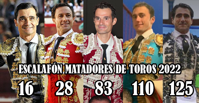 Este año, el primer torero murciano en aparecer en el escalafón de matadores de toros es Paco Ureña. El de Lorca está en el puesto 16, con un total de 25 tardes toreadas y 36 orejas cortadas. En plazas de primera ha actuado en un total de 7 ocasiones, cortando 6 apéndices. Por encima de él, en el puesto 15, está Cayetano Rivera, mientras que, por debajo, en el puesto 17, está Manuel Escribano. De no haber sido maltratado al principio de temporada, donde se quedó fuera de la feria de Fallas de Valencia, plaza donde ha conseguido enormes éxitos y logros, el lorquino podría hacer alcanzado el top ten. Brilló en el final de temporada, con actuaciones notables en Bilbao, Murcia, Albacete y Salamanca. La temporada 2023 es clave para él. La afición espera volver a verle en su mejor versión. Madrid, otra de sus plazas, la que se lo ha dado prácticamente todo, es el lugar idóneo para volver a hacer su nombre un imprescindible de las ferias.