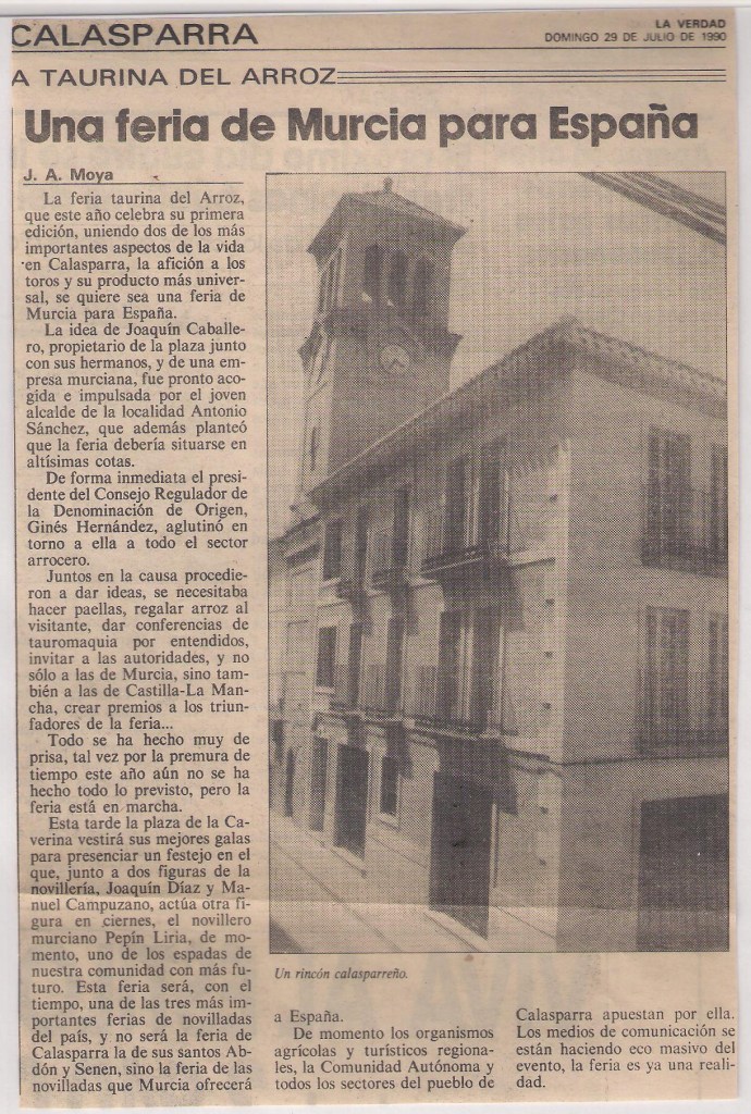 Como homenaje, queremos ofrecerles el artículo que publicó en el Diario La verdad de Murcia aquel domingo 29 de julio de 1990 en el que se celebraba la primera novillada de la Feria del Arroz de Calasparra. Dicha primera edición constaba de dos novilladas, pero se puede comprobar en su artículo que ya desde el principio la feria nació con una clara vocación de crecer.