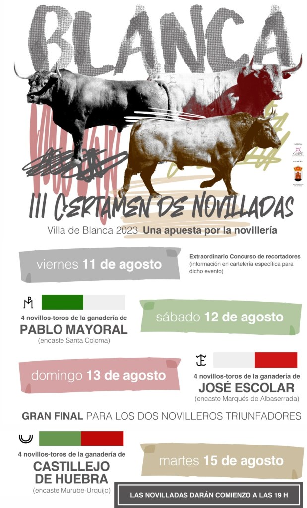 El Ayuntamiento de Blanca y la empresa Chipé Producciones han dado a conocer las ganaderías que formarán parte de la tercera edición del Certamen de Novilladas “Villa de Blanca” que se celebra durante el mes de agosto en esta población murciana bañada por el río Segura, en un lugar privilegiado del espectacular «Valle de Ricote».