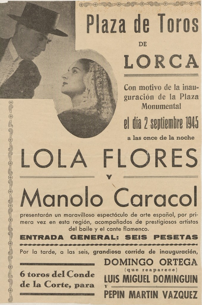 En la noche de aquel 2 de septiembre Lola Flores actuó en el ruedo del Coso de Sutullena junto a Manolo Caracol. Por aquel entonces el dúo de artistas causaban sensación entre la sociedad española. Un concierto histórico que se sumó a un festejo taurino para la historia, que se celebró por la tarde y en el que actuaron Domingo Ortega, Luis Miguel Dominguín y Pepín Martín Vázquez ante toros del Conde de la Corte. Todo para abrir la plaza de toros de Lorca después de su rehabilitación tras la Guerra Civil española.
