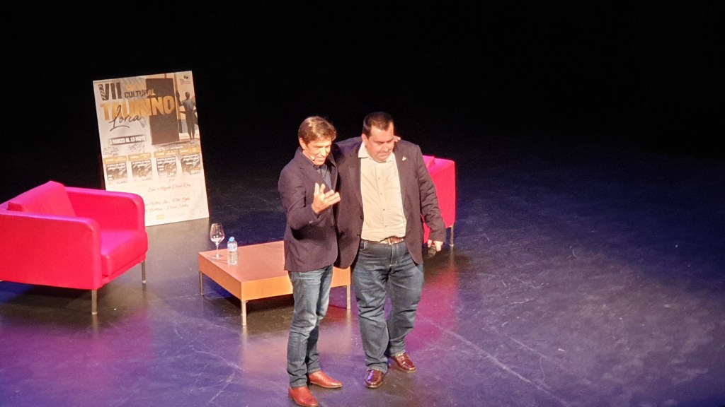 Manuel Díaz “El Cordobés” cerró anoche las tertulias del VII Ciclo Cultural Taurino de Lorca por todo lo alto. El madrileño llenó el Teatro Guerra de la Ciudad del Sol de centenares de aficionados que escucharon atentamente su filosofía de vida. Una noche genial, llena de simpáticas anécdotas en torno a la carrera profesional y personal del torero, que marcará un antes y un después en los actos organizados por el Club Taurino de Lorca. Y es que llevar a más de 500 personas a un evento de estas características es todo un hito que no hace nada más que reforzar las ganas inmensas que tiene la afición lorquina de ver de una vez por todas inaugurado su coso de Sutullena. En este aspecto, “El Cordobés”, con el gracejo que le caracteriza, se metió a todos los presentes en el bolsillo: “Es el momento de que todos los políticos estén alineados para abrir ya el magnifico coso que hay aquí”. Manuel, que este año se retira, se comprometió a torear un festival benéfico en Lorca pese a que ya no esté en activo.