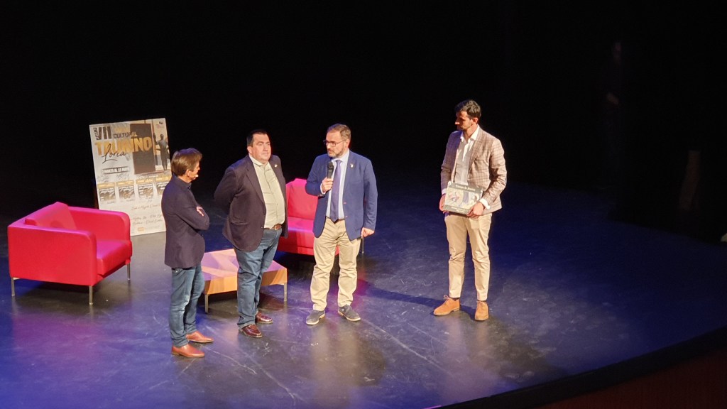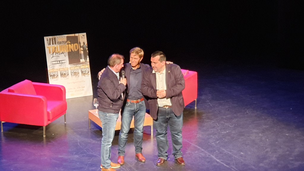 Al finalizar el acto subieron al escenario los toreros Domingo García “Dominguín” y Antonio Puerta, que expresaron su admiración hacia su figura. El presidente del Club Taurino, Juan Coronel, y el alcalde de Lorca, Diego José Mateos, pusieron la guinda al acto entregándole a Manuel Díaz “El Cordobés” detalles de su paso por Lorca.