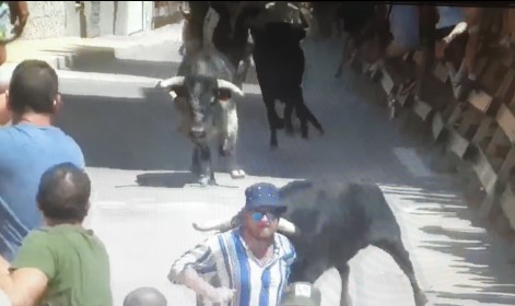 Lo peor se lo ha llevado un mozo inglés de 33 años, con sombrero de pescador y camisa de rayas azules, que se ha visto superado por la velocidad de los de Pablo Mayoral. El corredor ha caído delante de la cara del novillo que abría manada, y al querer levantarse tras pasarle este por encima, ha sido arrollado por otro novillo.